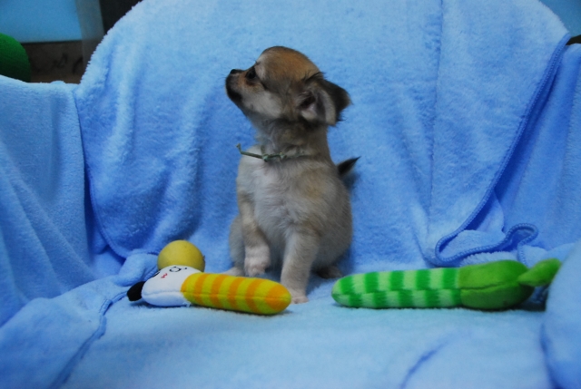 | コメント | 引き渡しは、2019年9月下旬以降の予定です。1回目のワクチン接種後となります。 2019年8月26日 体重は、351g。よちよち歩きです。 兄弟犬の中で最も成長している子です。 離乳食を食べ始めましたが、まだ母乳がメインです。 成長と共に活発になると思います。(今後の成長を待って下さい) 2019年9月1日 体重は、400g。 ケージの中で自由に歩き回る様になりました。 兄弟犬の中で一番成長しているので動きも他の子に比べて活発です。 離乳食を終えて、母犬と同じフードをお湯でふやかした食事になりました。 食事の準備をしているとケージの出入り口に来てご飯を待っています。 2019年9月6日 体重は、418g。 ケージの外でも歩き回る様になりました。まだ、行動範囲は狭いです。 2019年9月13日 体重は、570g。 食事の後にケージの出口を開けると一斉に飛び出して部屋の中を走り回っています。 まだおぼつかない足取りで勢いあまってよく転んでいます。 いろんな物に関心を抱くようになり、咬んで確認しています。 兄弟の中で一番人懐っこいです。 普段居るケージがある場所と違うところで撮影しているので少し緊張しているようです。 2019年9月20日 体重は、610g。 食事後は、室内で兄弟たちと運動会です。 おもちゃなどいろいろな物に興味を持ち、銜えたまま走ったりして遊んでいます。 足元にまとわりつくなど人に対しても関心を持つようになりました。 9/18にワクチン接種しましたので引渡可能となりました。 動画の最後に普段生活している部屋で食事後兄弟全員で自由にさせている映像を入れました。 特定の子犬をカメラで追いかけるのは厳しいので雰囲気を見てください。 2019年9月28日 体重は、800g。 毎日元気に走り回っています。 人懐っこくなり、足元にまとわりついたり膝の上に乗ったりして遊んでくれます。 |