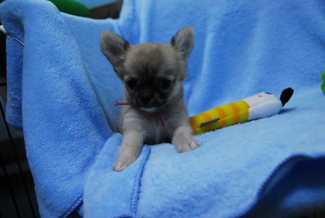 | コメント | 引き渡しは、2019年10月初旬以降の予定です。1回目のワクチン接種後となります。 2019年9月1日 体重は、305g。よちよち歩きです。 離乳食を食べ始めましたが、まだ母乳がメインです。 口元の黒い被毛は、成長と共に薄くなりやがてなくなります。(まれに成長してもそのままの子もいます) 成長と共に活発になると思います。(今後の成長を待って下さい) 2019年9月6日 体重は、348g。 歩き回る様になりましたが、まだ行動範囲は狭いです。 そろそろ子犬用のドックフードに切り換える予定です。 2019年9月13日 体重は、442g。 食事の後、ケージ外で自由行動の時間。出口を開けると一斉に出ますがまだ慎重で出口の近くで歩き回っている状態でしす。 時々おもちゃにも興味を示しますが、音を鳴らすと怖がっています。 普段居るケージがある場所と違うところで撮影しているので緊張しているようです。 2019年9月20日 体重は、500g。 食事の後にケージの出口を開けると一斉に飛び出して部屋の中を走り回っています。 まだおぼつかない足取りで勢いあまってよく転んでいます。 いろんな物に関心を抱くようになり、おもちゃで遊んだり色々な物を咬んで遊んでいます。 動画の最後に普段生活している部屋で食事後兄弟全員で自由にさせている映像を入れました。 特定の子犬をカメラで追いかけるのは厳しいので雰囲気を見てください。 2019年9月28日 体重は、640g。 食事後は、室内で兄弟たちと運動会です。 おもちゃなどいろいろな物に興味を持ち、銜えたまま走ったりして遊んでいます。 足元にまとわりつくなど人に対しても関心を持つようになりました。 9/25にワクチン接種しましたので引渡可能となりました。 |