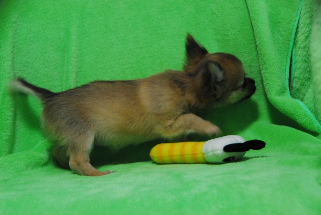 | コメント | 引き渡しは、2019年10月初旬以降の予定です。1回目のワクチン接種後となります。 2019年9月1日 体重は、310g。よちよち歩きです。 離乳食を食べ始めましたが、まだ母乳がメインです。 口元の黒い被毛は、成長と共に薄くなりやがてなくなります。(まれに成長してもそのままの子もいます) 成長と共に活発になると思います。(今後の成長を待って下さい) 2019年9月6日 体重は、374g。 歩き回る様になりましたが、まだ行動範囲は狭いです。 そろそろ子犬用のドックフードに切り換える予定です。 2019年9月13日 体重は、470g。 食事の後、ケージ外で自由行動の時間。出口を開けると一斉に出ますがまだ慎重で出口の近くで歩き回っている状態でしす。 時々おもちゃにも興味を示しますが、音を鳴らすと怖がっています。 普段居るケージがある場所と違うところで撮影しているので緊張しているようです。 2019年9月20日 体重は、550g。 食事の後にケージの出口を開けると一斉に飛び出して部屋の中を走り回っています。 まだおぼつかない足取りで勢いあまってよく転んでいます。 いろんな物に関心を抱くようになり、おもちゃで遊んだり色々な物を咬んで遊んでいます。 動画の最後に普段生活している部屋で食事後兄弟全員で自由にさせている映像を入れました。 特定の子犬をカメラで追いかけるのは厳しいので雰囲気を見てください。 2019年9月28日 体重は、740g。 食事後は、室内で兄弟たちと運動会です。 おもちゃなどいろいろな物に興味を持ち、銜えたまま走ったりして遊んでいます。 足元にまとわりつくなど人に対しても関心を持つようになりました。 9/25にワクチン接種しましたので引渡可能となりました。 2019年10月6日 体重は、780g。 おもちゃで一人遊びもする様になりました。 |
