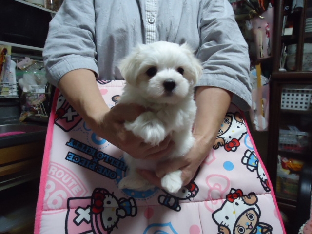 この度ご縁がありまして村島ブリーダーさんから可愛いマルチーズの男の子を譲って頂きました。犬を飼うことは初めてだったのですが2度ほど見学し、アドバイスも頂き、安心して子犬を迎えることができました。何かあれば電話でいつでも相談にのって下さるとのことで心強いです。子犬もとても元気でおトイレもすぐに覚えてとってもいい子です。ありがとうございました。(栃木県 女性)