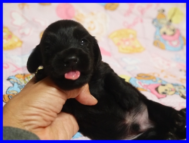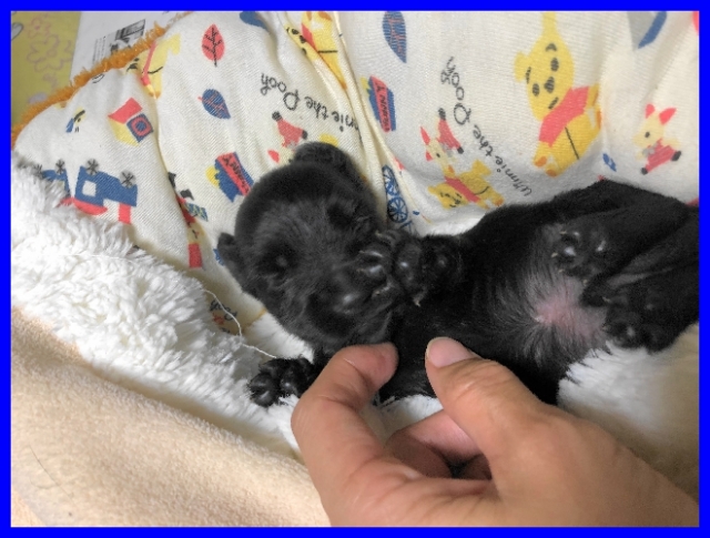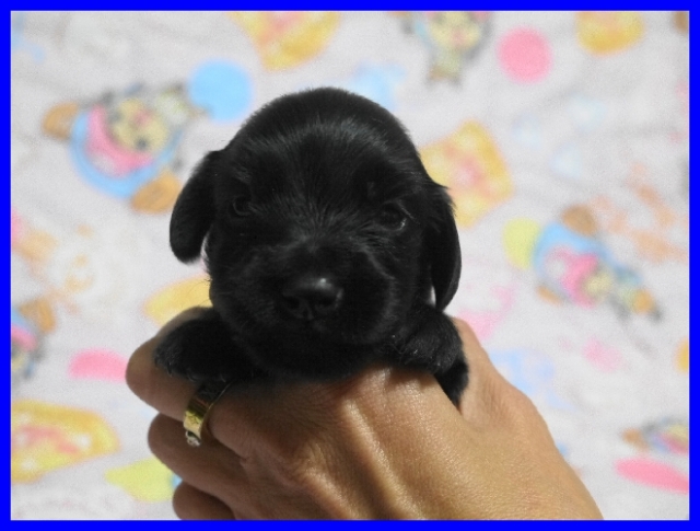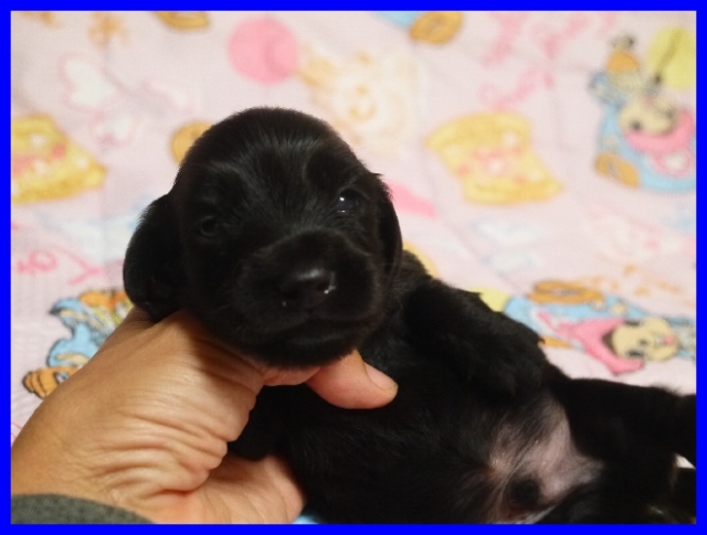 | コメント | パパはブラックソリッド。ママはチャンピオン直娘のイエローブリンドル。 子犬ちゃんは2頭兄妹で生まれました。 男の子は小ぶりでコンパクトサイズです。 お迎えいただけるのはワクチン接種と健康診断を実施後で10月下旬頃です。 当方はキャッシュレスポイント還元事業店舗のため、10月以降の精算時にクレジットカード決済の場合は後日5%分のポイントが政府より還元されます。 ぜひご利用ください。 まっくろくろすけなので、写真だとかわいさが良くわからないかもしれませんが、実際に会っていただけるととてもキュートなぼくちゃんです。 家族の一員としてかわいがってくださる方からのお問い合わせをお待ちしております。 PRA(遺伝性網膜委縮)の遺伝子検査を両親ともしており、両親共にクリアですので、安心してお迎えしていただけます。 お問い合わせをお待ちしております |