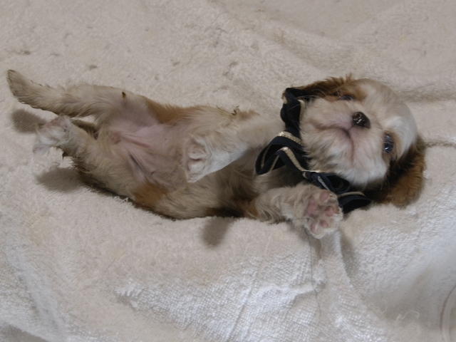 この度はとっても元気な子をありがとうございました。 見学の際は駅まで迎えにきていただき、説明もとても丁寧で安心しました。 空輸で送っていただき、ありがとうございました。 迎えてから一週間が経ち、家にも慣れて、へそ天で寝ています。 トイレトレーニングも、来た時から8割できていて、今ではほとんど失敗しなくなりました。 可愛く元気で、毎日元気に飛び跳ねています。(奈良県 女性)