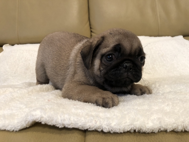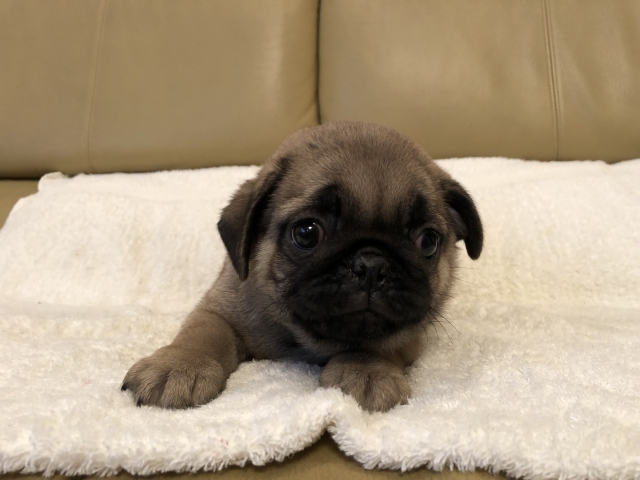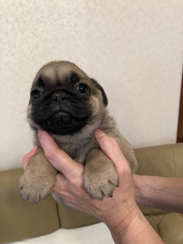 パグの飼育歴は30年以上になります。今年親の代から買っていた 黒パグを亡くしてから家を埋め尽くしているパググッズを見るたびに いつか新しい仔を迎えたいと思うようになりました。 北関東でブリーダーさんを探しているうちに木村様を知り、見学、購入の運びとなりました。 このたび性格も大変おおらかな素晴らしい仔犬をお譲りいただき大変感謝しております。 (茨城県 男性)