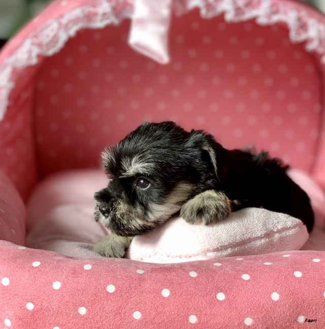 シュナウザーを主力にされているブリーダーさんだと認識しており、ボスちゃんはどうかなあと正直不安でしたがとても可愛く健康的なボスちゃんをいただきました。 掲載されていた写真より実物は想像以上に可愛くて即決し見学させていただいたその日に連れて帰りました。連絡をして、翌日行きますぅって勝手な申し出にも関わらず敏速かつ親切に対応して頂き大満足です。契約に対しても一つ一つ丁寧に説明してくださり、わかりやすかったです。この度は可愛いボスちゃんとのご縁をいただき、本当に有り難うございました。 (大阪府 女性)
