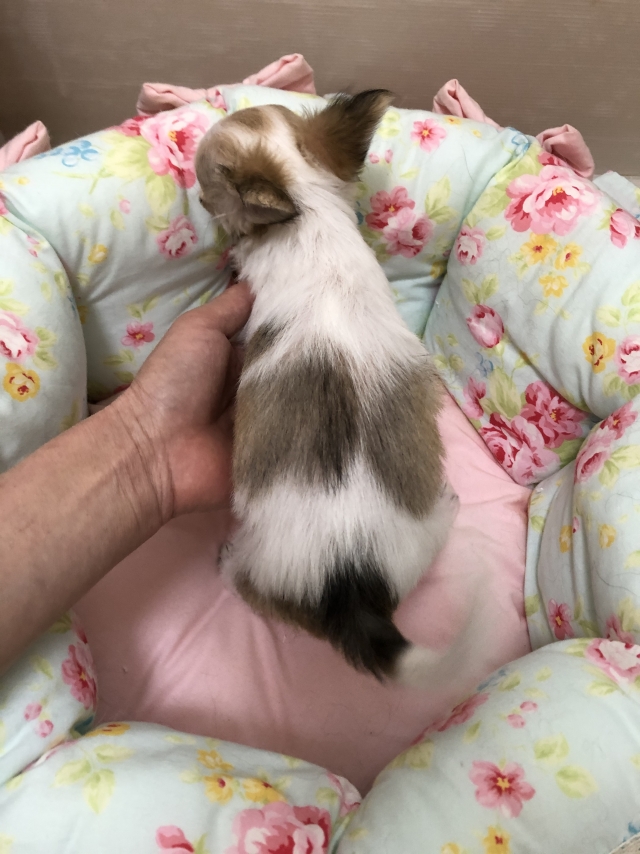 | コメント | とっても可愛い小さな女の子ちゃんです♪ 小さいけどとっても元気。 毎日ベビーたちと元気に走り回っています。 呼ぶと尻尾を高速フリフリして全身を使って大喜び(^^) 撫でられるのとお膝の上でまったりするのが大好き♡ 甘えたさんでとっても人懐こくて誰にでも尻尾フリフリの性格抜群な女の子です。 ご飯も大好きで食い付きにムラはあるものの1日に食べる量はほぼ一定で、サイズの割によく食べてくれています。 ドライフードを一粒ずつゆっくりと食べるので時間はかかりますが。 今まで低血糖になったことは一度もありません。 成犬時の予想サイズは1.3〜1.5kg程度予想です。 3/9現在950g(満腹の食後計測)、やっとここまで大きくなりました。 このサイズまで育つとお迎えされる方も安心かとおもいます。 尻尾フリフリですが、基本おっとりとしたのんびり屋さん。 ゴロゴロまったりも大好き♡ 犬も人も大好きで尻尾フリフリ。 おっとりですが社交的なサイズの割に手の掛からない子です。 とにかくこの性格はやみつきになる可愛いさです。 おトイレのしつけも生後2ヵ月からフリーの状態でも完璧です。 現在成長過程のブサイク期真っ只中の為、コートがしょぼしょぼになっていますが、これからコートも伸びてきますのでご安心ください。 可愛いと人気のママにそっくりに成長中です。 我が家の愛犬たちは先祖代々、両親共に性格の良い子達です。 我が家では性格の悪い子(攻撃性のある子、ビビりな子、よく吠える子など)は代々一切繁殖には使っておりません。 性格は遺伝しますので、人懐こくて明るい親犬のみでブリーディングしていますので、どの子犬もフレンドリーな性格です。 そしてドッグショーにも出陳して犬質を確かめながらブリーディングしています。 また健全性を求めていますので、チョコ、ブルー、イザベラ、マール、ソリッドなどのレアカラーも我が家の血統には一切入れておりません。 また我が家のチワワ達は引退犬も含めて全頭PRAの遺伝子検査を行い、全頭クリアですのでこの子もクリアです。 ワクチン1回めも済みましたので、ご見学と同時にお迎えも可能です。 当方のInstagramには画像や動画を掲載しています。 是非ご見学にいらしてくださいね。 お問い合わせはどのような小さな事でもお気軽にどうぞ。 ※チワワは小さな犬種ですし、当方のチワワは一般よりもサイズの小さい子が多いため、動物愛護の観点から小学3年生以下のお子様のいらっしゃるご家庭、65歳以上の方のみのご家庭へはお譲りしておりません。 またこの子につきましてはサイズが特別に小さいので、常にどなたかがいらっしゃる環境の方のみお問い合わせくださいませ。 ご理解くださいますようお願い申し上げます。 |