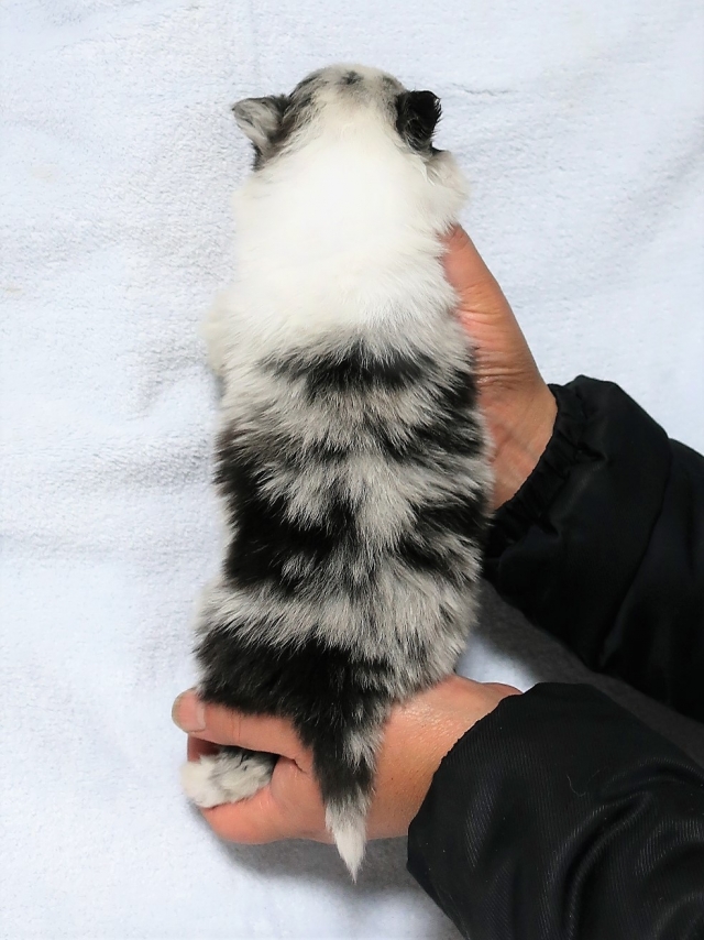 | コメント | 天真爛漫で人と遊ぶのが大好きな男の子 トイレトレーニング済です。決められた場所で排泄するようしつけましたので 部屋でフリーにしていてもほとんど粗相なし。 親兄弟はもちろん、それ以外もいる大家族の中で遊んだり叱られたりしながら 心身ともに健全な子に育っています。 右目がブルーです。 お鼻にピンク色の部分がありますが徐々に黒くなっていきます。 お父さんアメリカ&カナダチャンピオン お母さん JCCチャンピオンの娘 賞歴あり |