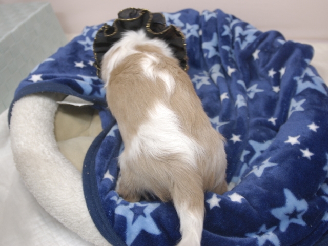| コメント | お父さんはJKCチャンピオンの吉宗君、お母さんはチャンピオン直子セリーヌちゃんから生まれたダンディーな男の子です。(黒リボン君) 健康状態は、問題有りません。 若干の鼠径ヘルニアがありますが、手術の必要はないと思われます。 すくすく育っています。 特典として、平日割引(2万円)見学並びに契約をして頂いた方。 土日祝日割引(1万円)見学並びに契約をして頂いた方、ジャンケンで勝ったら値引きします。 |
