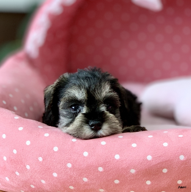 シュナウザーを主力にされているブリーダーさんだと認識しており、ボスちゃんはどうかなあと正直不安でしたがとても可愛く健康的なボスちゃんをいただきました。 掲載されていた写真より実物は想像以上に可愛くて即決し見学させていただいたその日に連れて帰りました。連絡をして、翌日行きますぅって勝手な申し出にも関わらず敏速かつ親切に対応して頂き大満足です。契約に対しても一つ一つ丁寧に説明してくださり、わかりやすかったです。この度は可愛いボスちゃんとのご縁をいただき、本当に有り難うございました。 (大阪府 女性)