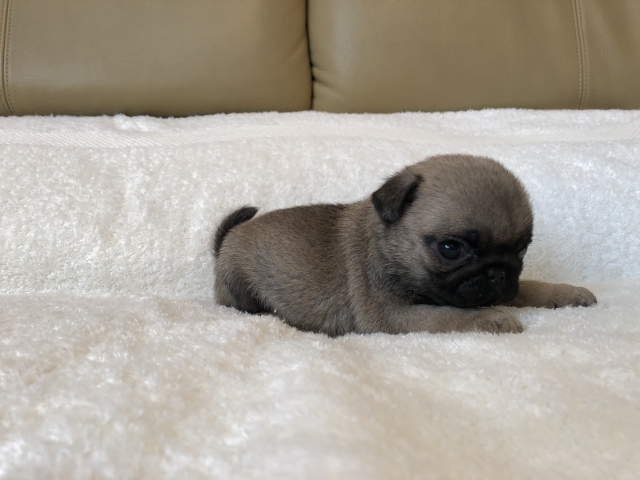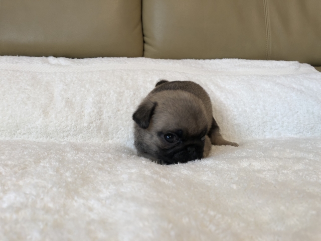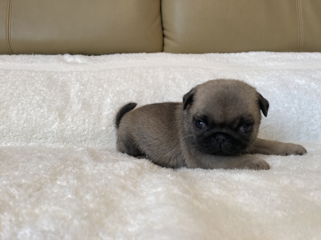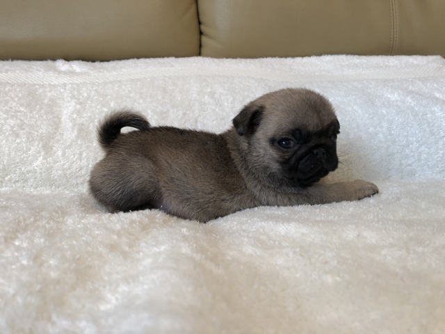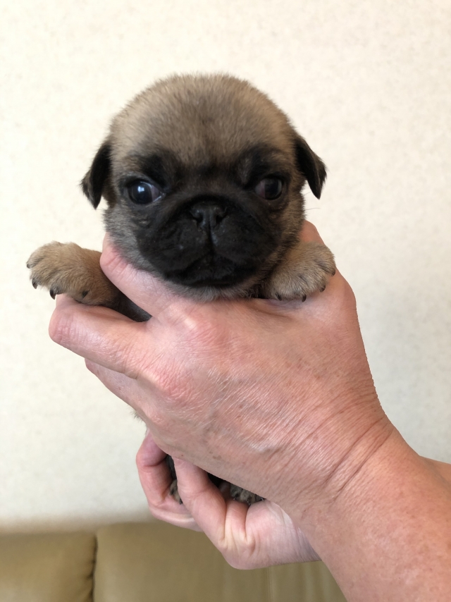 パグの飼育歴は30年以上になります。今年親の代から買っていた 黒パグを亡くしてから家を埋め尽くしているパググッズを見るたびに いつか新しい仔を迎えたいと思うようになりました。 北関東でブリーダーさんを探しているうちに木村様を知り、見学、購入の運びとなりました。 このたび性格も大変おおらかな素晴らしい仔犬をお譲りいただき大変感謝しております。 (茨城県 男性)