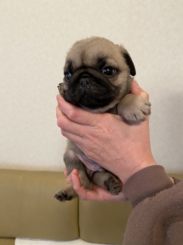 パグの飼育歴は30年以上になります。今年親の代から買っていた 黒パグを亡くしてから家を埋め尽くしているパググッズを見るたびに いつか新しい仔を迎えたいと思うようになりました。 北関東でブリーダーさんを探しているうちに木村様を知り、見学、購入の運びとなりました。 このたび性格も大変おおらかな素晴らしい仔犬をお譲りいただき大変感謝しております。 (茨城県 男性)