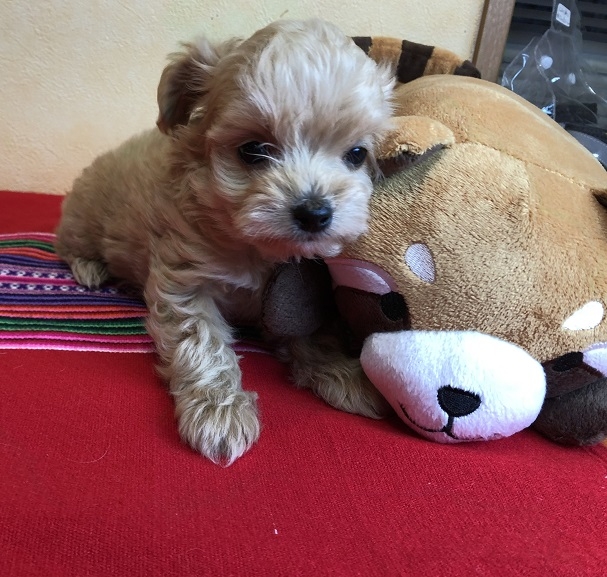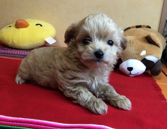 | コメント | トイプードルのママとチワワのパパから誕生した かわいいかわいいチワプーの女の子! ご家族の一員にしてもらえれば、楽しい生活になりますよ! 2月16日現在の体重は500gです。 ワクチン1回分(5500円)は別途お願い致します。 お引渡しは2月下旬頃ですが、生体価格の30%以上ご入金でご予約は大丈夫です。 ご見学はあらかじめ日程をお知らせください。 |