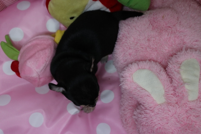 この度は可愛いカニンヘンダックスの女の子を譲っていただきありがとうございます。濱田さんのところからのお迎えは2頭目で、可愛さは初めの子でわかりすぎるほどわかっていたので絶対可愛くなること間違いなしで決めさせていただきました。 どんなことでも相談してくださいねと言う心強い言葉や、可愛い動画を送っていただいたりと本当によくしていただけました。 ワンちゃんは初日からアイコンタクトばっちり、よく食べ、よく寝て、元気いっぱいです。 家にきて1週間、先住犬と遊びながら元気に成長中です。 またよろしくお願いします。(大阪府 女性)