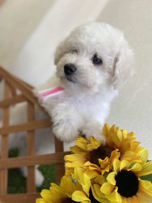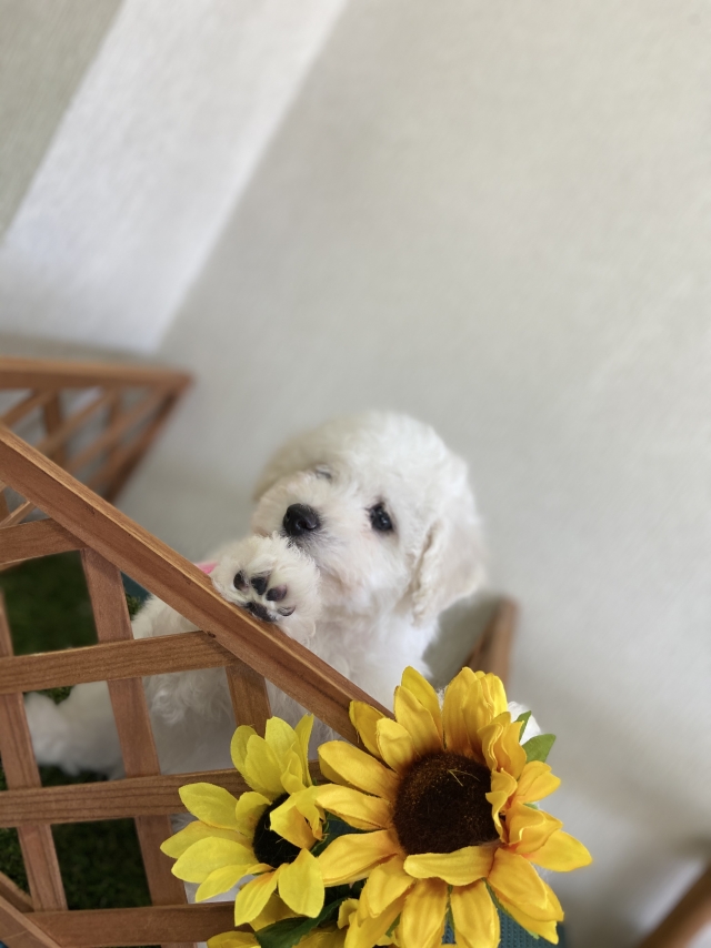 ビションフリーゼが欲しくても 地元には、なかなかいないと思って 県外にお迎えに行こうとまで思ってましたが、たまたま、見たブリーダーズに県内に居るのを見つけて、 早速、見学の申し込みをしましたが、直ぐには行けない旨を伝えると、 動画を送ってくださり、動画で即決しました! その後会いに行っても可愛いの一言で、直ぐには連れて帰りたかったほどです(笑) お迎えも待ち遠しく、揃えるものも色々アドバイス頂き、万全にお迎えできました。 お迎えした日も夜は泣くかもと言われましたが、全く泣くことなく、 すっかり、欠かせない存在です。 出会いに感謝しています。 ありがとうございました! 良いブリーダーさんに出会えたことも感謝です。 (福岡県 女性)