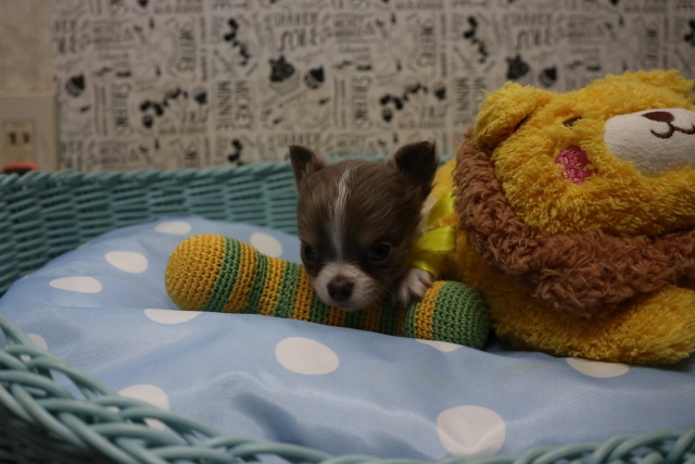 | コメント | お父さんチョコクリームの『シン』君。2.5㌔のPRAクリアーのイケメン君! お母さんチョコタン&ホワイトの『チロル』ちゃん。1.8㌔のお母さん。 小さな小さなチワワちゃんになりますよ! 皆様からのご質問、お問い合わせ、ご見学お待ちしています! 大阪市 濱田 |