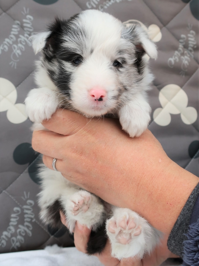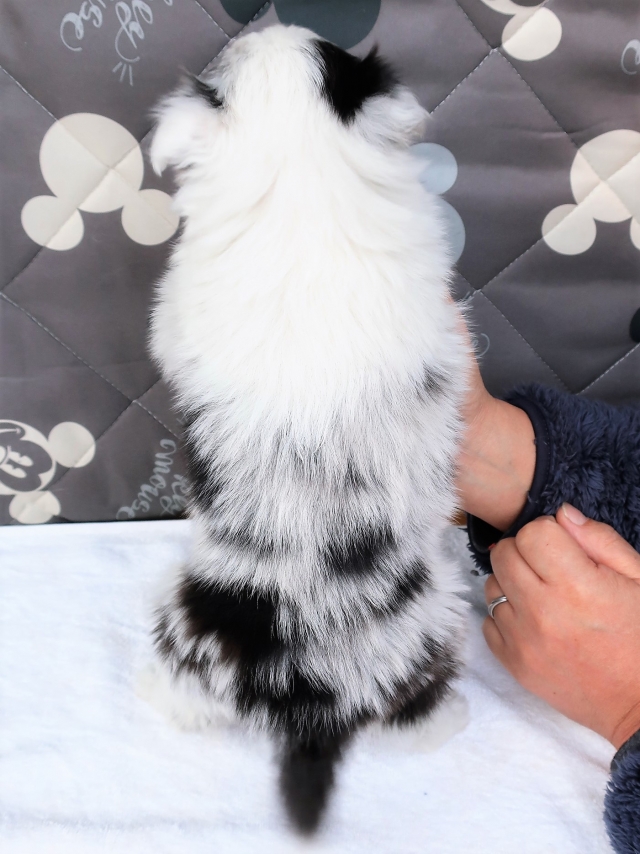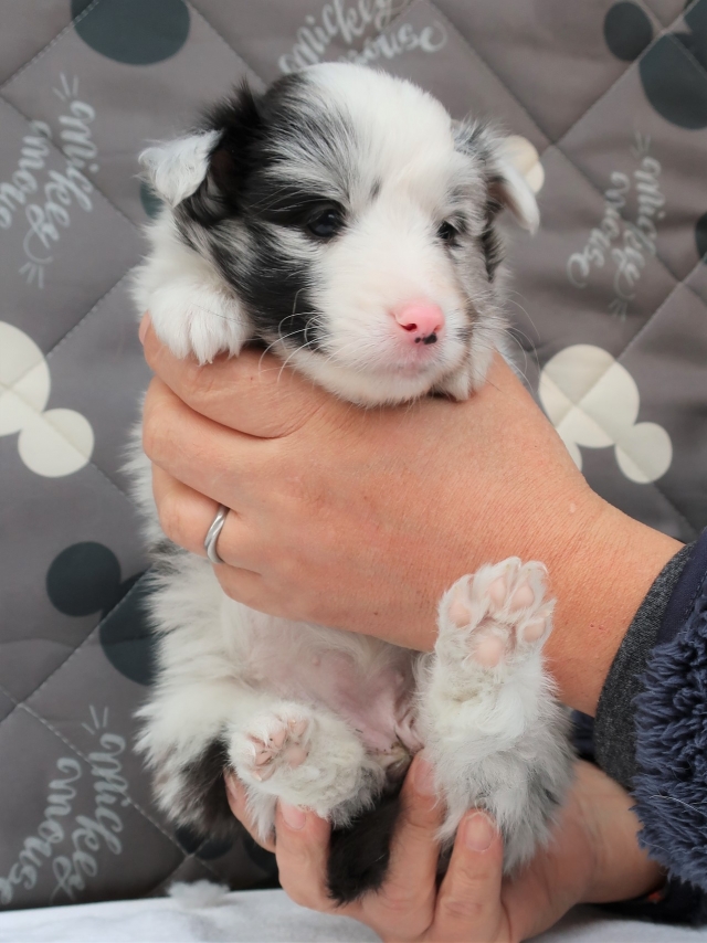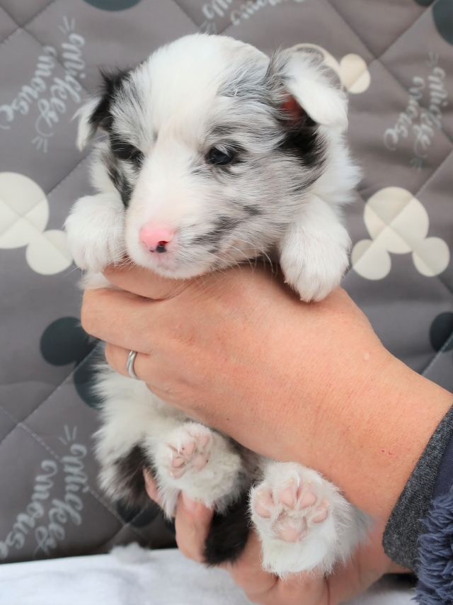 ネットブリーダーズを拝見し、バイブルーで青い目の子犬「銀くん」に一目ぼれしました。また、平山ブリーダー様の口コミがとても良かったこともあり、不安なく連絡をさせていただきました。お問い合わせ後すぐに丁寧な返信をいただき、見学の日程もスムーズに決まりました。 実際に伺うと、かわいいたくさんのシェルティちゃん達に迎えられ、たくさんの質問にも丁寧に答えてくださり、大変安心しました。お迎えした銀くんは、最初の1日はおとなしく心配になるほどでしたが、2日目からは甘えたり鳴いたりと元気を取り戻し、とても可愛い姿を見せてくれています。 平山ブリーダー様の元で大切に育てられてきたことがよく分かり、銀くんをお迎えできて心から良かったと思っています。 素敵なご縁をありがとうございました。(福島県 女性)