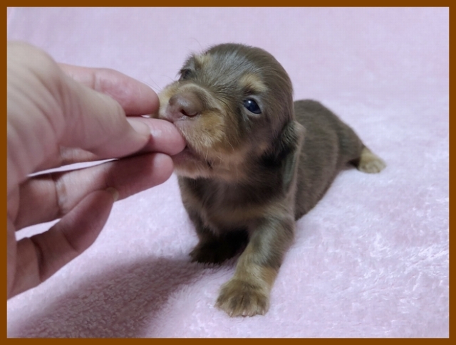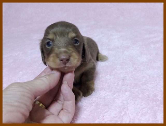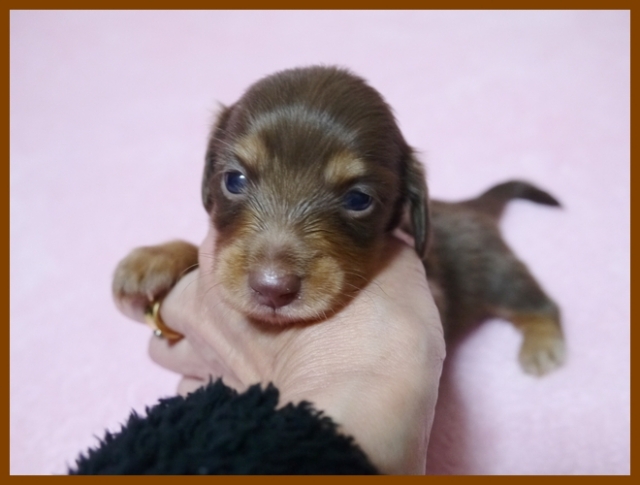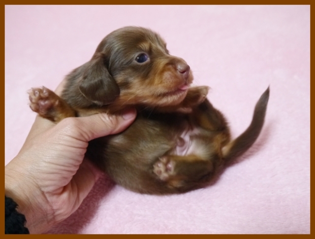 | コメント | パパはJKCチャンピオンのプラウド君(ブラック&イエロー) ママはJCKチャンピオン直娘の乙姫ちゃん(シルバーダップル) 子犬ちゃんはチョコレート&タンダップルの男の子です。 首の後ろにちょこっとだけダップルの柄がありますが、見た感じはチョコレート&タンですので、派手なダップルをお探しの方よりはチョコレート&タンをお探しの方へオススメです。 親犬は全頭DNAの遺伝子検査をしておりますので、子犬ちゃんがPRA(遺伝性網膜委縮症)を発症する心配はございません。 現時点で欠点などもなく、とても良い子に育っています。 4頭兄妹ですくすくと健康に順調に成長しています。 現時点での欠点などはありません。 お問い合わせをお待ちしております。 |