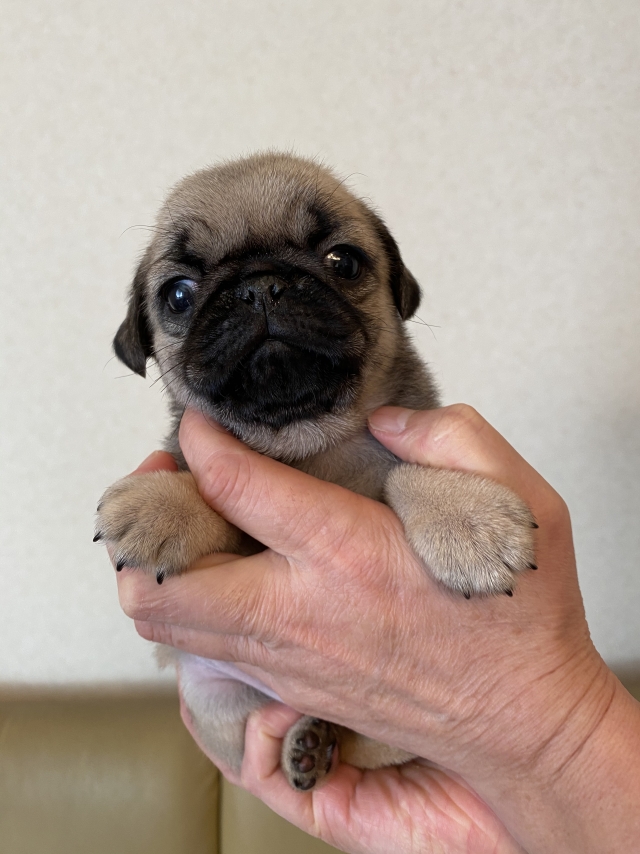 パグの飼育歴は30年以上になります。今年親の代から買っていた 黒パグを亡くしてから家を埋め尽くしているパググッズを見るたびに いつか新しい仔を迎えたいと思うようになりました。 北関東でブリーダーさんを探しているうちに木村様を知り、見学、購入の運びとなりました。 このたび性格も大変おおらかな素晴らしい仔犬をお譲りいただき大変感謝しております。 (茨城県 男性)