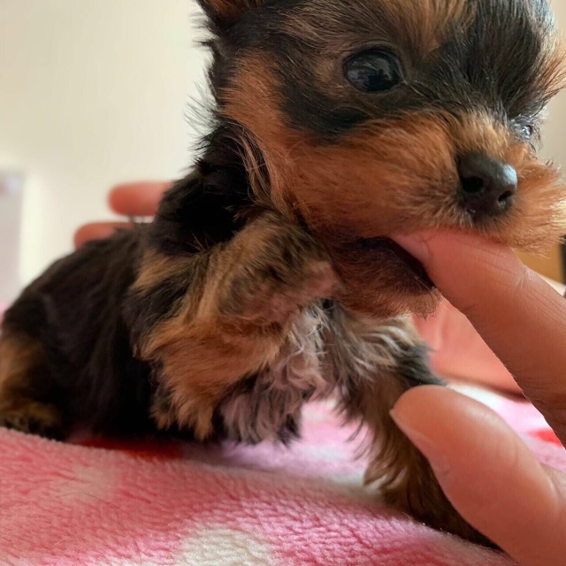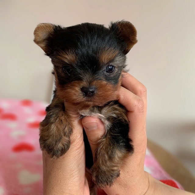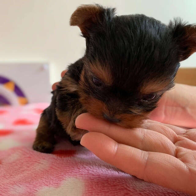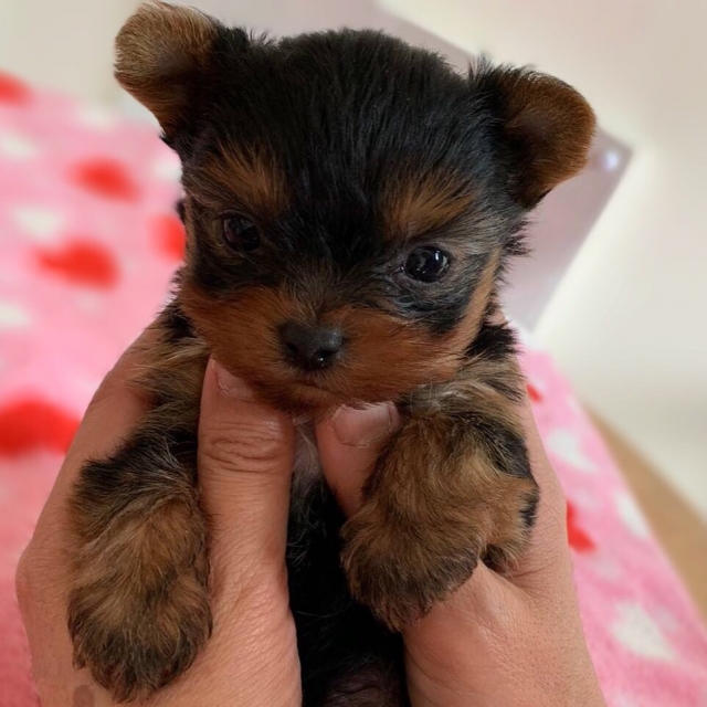 究極おチビちゃんでお顔の可愛い ヨークシャテリアが家族の一員になりました!! お顔、サイズ,性格、こだわりが物凄く強い私にとって運命の子と出逢えた事♡ 長見ブリーダーさんには感謝でいっぱいです。 我が家に迎えた当日トイレも完璧でした。無駄吠えもせず 現在も超ミニミニで元気いっぱいの娘です。名前を呼ぶと飛んで来ます! かわいいね〜と呼んでも口癖なので 飛んできます! もう可愛いくて可愛いくての言葉 しかありません。これからも愛情たっぷり大切に育てていきたいと思います。 (東京都 女性)