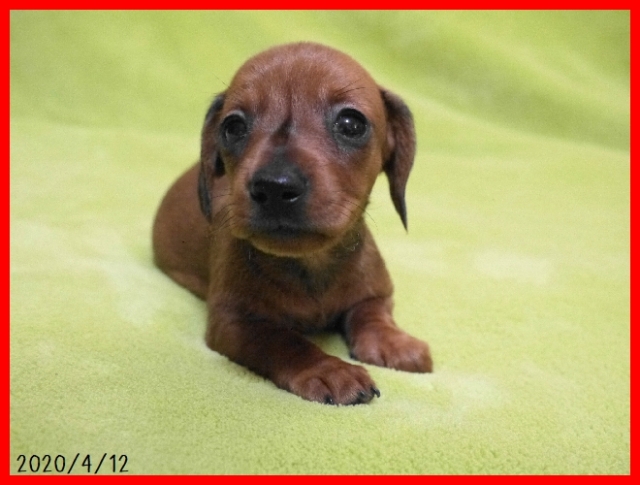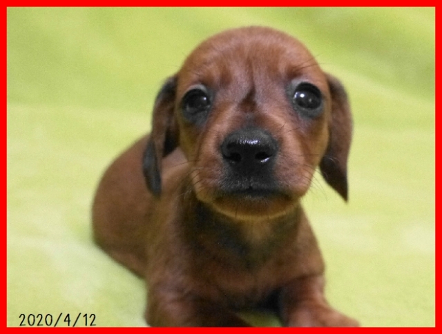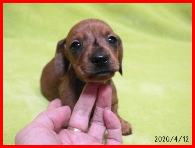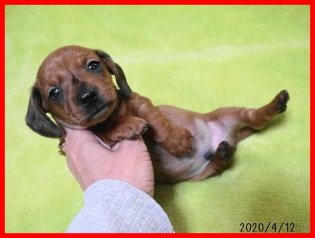 | コメント | パパはハンガリーからの輸入犬でモルドヴァチャンピオンのホーカスポーカス君(ブラック&タン)。 パパの登録カニンヘンスムースダックスです。 ママは体重3.5キロで小ぶりなミニチュアスムースダックスのぴのこちゃん。(レッド) アメリカからの輸入チャンピオン犬の血統のとても良い子です。 子犬はレッドの男の子で登録はミニチュアスムースダックスとなります。 小ぶりなサイズに仕上がるかなと思います。 とても元気で健康にすくすくと成長してしています。 お引き渡しはワクチンと健康診断を実施後でゴールデンウイーク頃となります。 見学していただけますので、お問い合わせをお待ちしております。 |