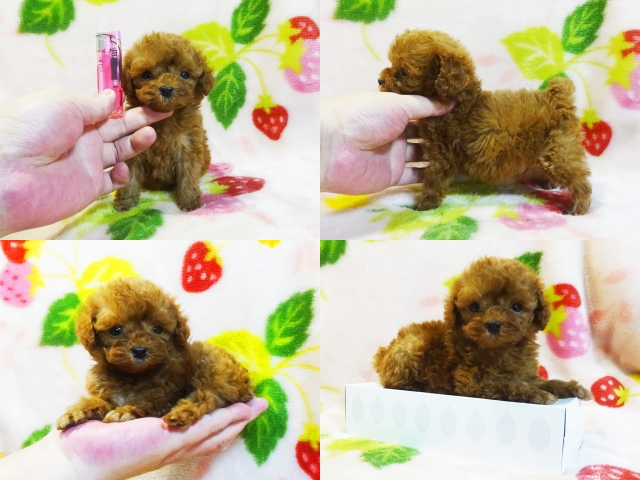 | コメント | ☆マイクロティーカップ予想!!☆ホント小っちゃくてビックリですよ!! クリクリのお目々に超短いお鼻チビチビめっちゃカワイイ男の子♪ 小っちゃい幼顔で見つめられるとキュンッ!!となっちゃいますよ^^ 毛量も豊富で巻きも良好毛色も濃くてとっても綺麗なレッドです!! 小さくてもとっても元気ティーカップ兄弟達と仲良く遊んでます♪ 生後60日の体重は約480g成犬予想体重1.5kg未満だと思います☆ 無理に小さく育てたTカップとは違って本当に元気な健康優良児♪ 身体のバランスが良くしっかりした硬い胴で骨量の多い丈夫な仔☆ 現状噛合せや骨格・関節形成など欠点の心配は一切ありません!! 離乳も済み食欲旺盛ドライでカリカリ!!いつでもお引き渡しOK♪ 素敵なご家族様からのお問い合わせをお待ちしております^^ 【その他諸費用】 6種ワクチン接種費用:6千円【税・画像入証明書付・健康診断込】 ※お迎えの場合で【生体代金】+【ワクチン接種費用】のみです。 ●血統書登録団体:JKC(※3ヵ月以上要す事もあります) |