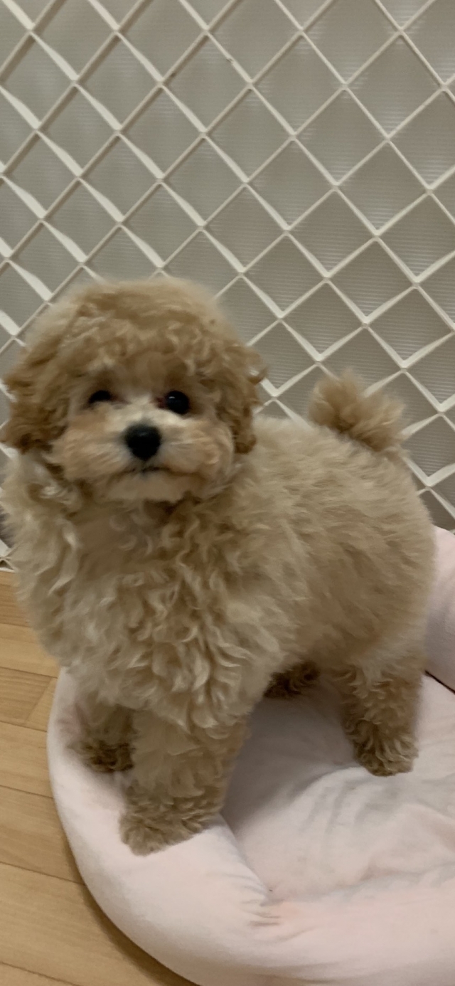 問い合わせをするとすぐに連絡をいただき、2日後に見学に行かせてもらいました。綺麗な応接室でワンちゃんとご対面。問い合わせた子は初めての応接室にガクブル震えていましたがそれが愛らしかったです。兄弟、ママ、パパにも会わせてもらい成長したらこの位というのがわかりました。お迎えもこちらの都合で予定より遅くなってしまいましたが快く引き受けて下さいました。ゲージ内では初日からちゃんとトイレシートでできました。すごーいえらーい!と感動でした。我が家に来てご飯を食べてくれず心配でメールをしたらすぐに電話くれ色々教えてくださいました。夜泣きは続きましたが、心を鬼にしシカト。鳴く時間も段々減っていきました。2週間たった今はリビングに放してもちゃんとトイレに行ってオシッコウンチできるようになりました。朝は家族が起きてくるとみんなにしっぽフリフリおはよー♡の挨拶をしてくれます。小学生が3人いますがナルが心配で学校から毎日走って帰ってくるようです。長年のトイプードルを飼うという夢が叶った長男は毎日とてもよくお世話をしてくれます。子供達は学校で嫌な事があってもナルがいるから頑張れる!と言っています。子供達の心も育ててくれています。ナル=ハワイで波の意味。ハワイではナルNalu(波)幸せを運んでくれる、絶え間なく訪れる幸せという意味です。 iPhoneから送信(埼玉県 女性)