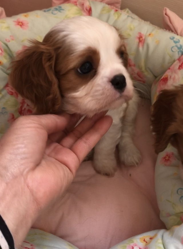 | コメント | ぐちゅっとした短いお鼻でとっても可愛いお顔の男の子です。 毛量も豊富でモコモコふわふわ。 まだヨチヨチ歩き始めたばかりですが、尻尾フリフリ寄ってきます。 性格はいつものように明るくて人懐こい子に成長中です。 おでこの模様は今は幅広ですが、成長と共に狭くなり程よい太さになります。 ベビーの頃は太めぐらいがちょうど良いです。 Instagramに動画を掲載しています。 小さな出臍があります。 パパ インターナショナルビューティーチャンピオン ママ 英国系 ご見学可能です。 北海道(千歳)、関東方面の方はお引渡し時代行の利用が可能です。 代行利用の場合はこちらまでご見学に来る必要がありません。 (関東方面空輸代行料別途35000円、千歳38000円) ワクチン接種も完了しましたので、ご見学と同時にお迎え可能です。 我が家のキャバリア達は全頭遺伝子検査(変性性脊椎症 DM)を受けております。 キャバリアは変性性脊椎症(DM)を発症しやすいと言われておりますが、我が家で産まれるキャバリアはこの病気は発症しません。 また最近時々見かけるのですが、キャバリアの交配でタブーとされているパーティーカラー(ブレンハイムとトライ)とホールカラー(ルビーとブラックタン)の交配も一切行なっておりません。 【ご見学、お引渡し時のお願い】 今までは屋内でゆっくりとお客様のお時間の許す限りご見学いただいておりましたが、コロナ対策として屋外にてご見学、お時間はベビーのストレス軽減の為30分程度、そして必ずマスク着用と手の消毒をお願い致します。(消毒剤は用意しております。) また会話の距離もお互いの安全を考えて1m以上あけてさせていただきたいと思います。 せっかくお越しくださいますのにこの様なお願いをしなければいけない事が本当に心苦しいのですが、この様なご時世ですのでご理解くださいましたら助かります。 詳しくはお問い合わせ時にお伝えいたします。 初めて飼育される方には通常通り飼育説明を行なっています。 説明等はお互いの安全を考えて全てお電話にて対応いたします。 お引渡し後の困った事なども常に対応しています。 とっても可愛い子ですので、是非ご見学にいらしてくださいね。 |