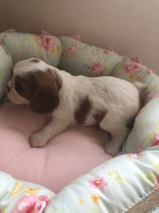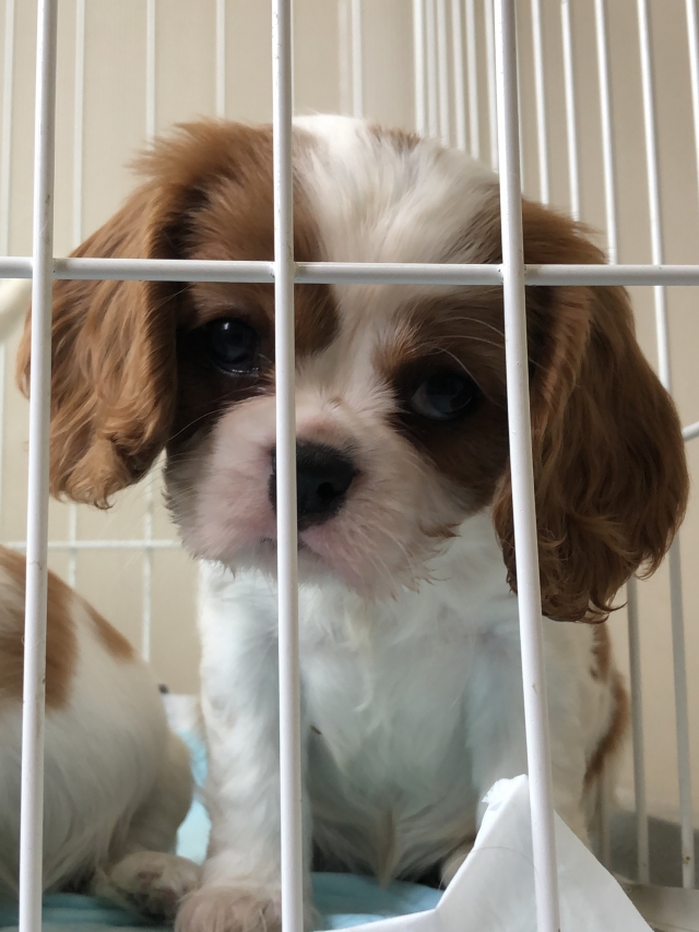 | コメント | ぐちゅっとした短いお鼻でとっても可愛いお顔の女の子です。 毛量も豊富でモコモコふわふわ。 まだヨチヨチ歩き始めたばかりですが、尻尾フリフリ寄ってきます。 性格はいつものように明るくて人懐こい子に成長中です。 噛み合わせがアンダーショットですが、お口を開けないと分からない程度です。 もちろん日常生活にも全く問題ありませんし、その分お鼻が短いです。 小さな出臍があります。 Instagramに動画を掲載しています。 パパ インターナショナルビューティーチャンピオン ママ 英国系 ご見学可能です。 北海道(千歳)、関東方面の方はお引渡し時代行の利用が可能です。 代行利用の場合はこちらまでご見学に来る必要がありません。 (関東方面空輸代行料別途35000円、千歳38000円) ワクチン接種も完了しましたので、ご見学と同時にお迎え可能です。 我が家のキャバリア達は全頭遺伝子検査(変性性脊椎症 DM)を受けております。 キャバリアは変性性脊椎症(DM)を発症しやすいと言われておりますが、我が家で産まれるキャバリアはこの病気は発症しません。 また最近時々見かけるのですが、キャバリアの交配でタブーとされているパーティーカラー(ブレンハイムとトライ)とホールカラー(ルビーとブラックタン)の交配も一切行なっておりません。 【ご見学、お引渡し時のお願い】 今までは屋内でゆっくりとお客様のお時間の許す限りご見学いただいておりましたが、コロナ対策として屋外にてご見学、お時間はベビーのストレス軽減の為30分程度、そして必ずマスク着用と手の消毒をお願い致します。(消毒剤は用意しております。) また会話の距離もお互いの安全を考えて1m以上あけてさせていただきたいと思います。 せっかくお越しくださいますのにこの様なお願いをしなければいけない事が本当に心苦しいのですが、この様なご時世ですのでご理解くださいましたら助かります。 詳しくはお問い合わせ時にお伝えいたします。 初めて飼育される方には通常通り飼育説明を行なっています。 説明等はお互いの安全を考えて全てお電話にて対応いたします。 お引渡し後の困った事なども常に対応しています。 とっても可愛い子ですので、是非ご見学にいらしてくださいね。 |