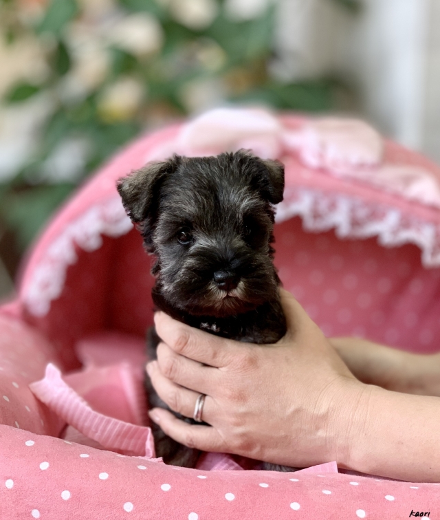 シュナウザーを主力にされているブリーダーさんだと認識しており、ボスちゃんはどうかなあと正直不安でしたがとても可愛く健康的なボスちゃんをいただきました。 掲載されていた写真より実物は想像以上に可愛くて即決し見学させていただいたその日に連れて帰りました。連絡をして、翌日行きますぅって勝手な申し出にも関わらず敏速かつ親切に対応して頂き大満足です。契約に対しても一つ一つ丁寧に説明してくださり、わかりやすかったです。この度は可愛いボスちゃんとのご縁をいただき、本当に有り難うございました。 (大阪府 女性)