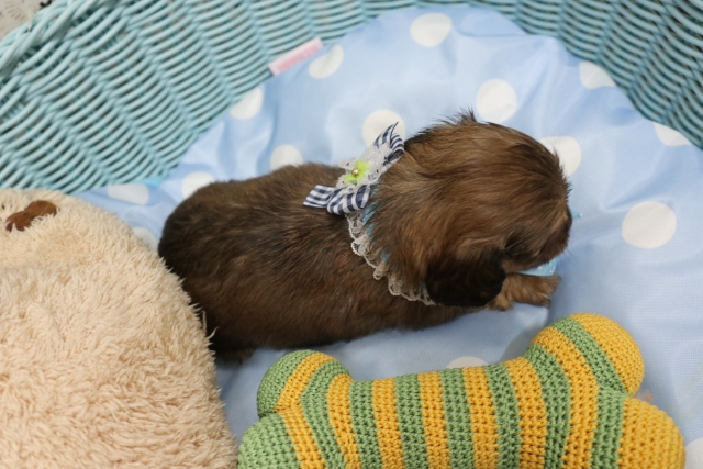 | 引渡可能日 | ワクチン接種後、生後50日前後より かつ、ちゃんと乳離れしてからです。 ※動物愛護法の改正に伴い生後56日未満の子犬の引き渡しは禁止されております。 生後56日未満であっても購入検討のために犬舎見学をすることは可能です。 (柴犬等の日本犬6犬種については例外で上記の生後56日未満が生後49日未満となります) |