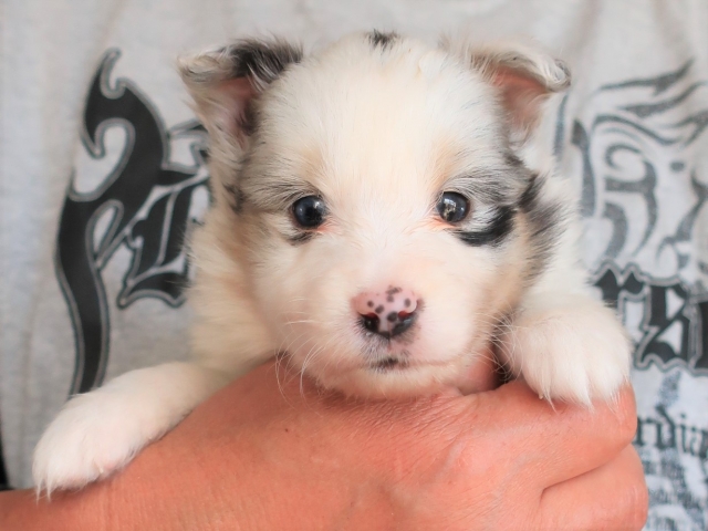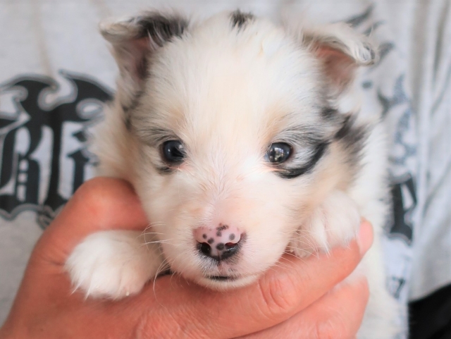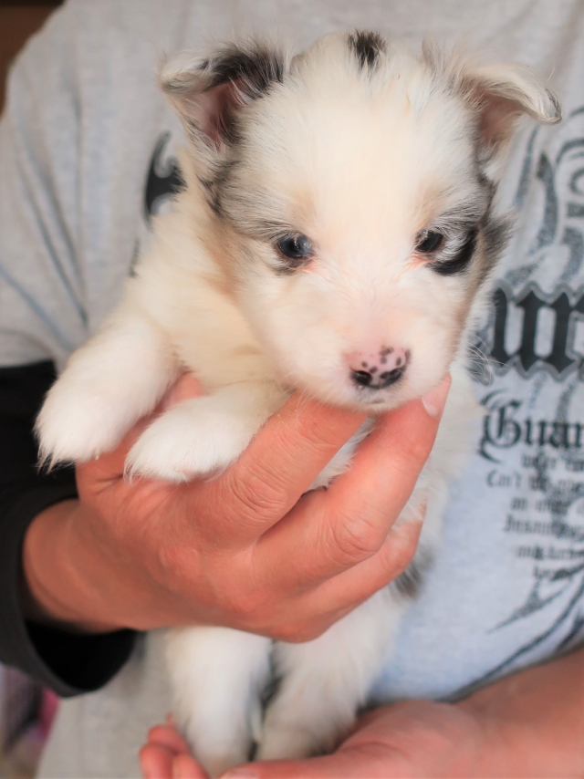 ネットブリーダーズを拝見し、バイブルーで青い目の子犬「銀くん」に一目ぼれしました。また、平山ブリーダー様の口コミがとても良かったこともあり、不安なく連絡をさせていただきました。お問い合わせ後すぐに丁寧な返信をいただき、見学の日程もスムーズに決まりました。 実際に伺うと、かわいいたくさんのシェルティちゃん達に迎えられ、たくさんの質問にも丁寧に答えてくださり、大変安心しました。お迎えした銀くんは、最初の1日はおとなしく心配になるほどでしたが、2日目からは甘えたり鳴いたりと元気を取り戻し、とても可愛い姿を見せてくれています。 平山ブリーダー様の元で大切に育てられてきたことがよく分かり、銀くんをお迎えできて心から良かったと思っています。 素敵なご縁をありがとうございました。(福島県 女性)