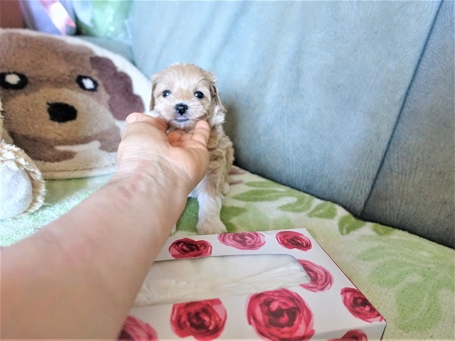 兵庫県から飛行機とレンタカーを利用しお迎えいただきました。 車ご利用でのお迎えは、子犬の不安や初めての遠距離車移動での車酔いを防ぐ為に、運転手以外の方で膝に抱きコミュニケーション取りながらとお願いしましたら、他県にお住まいのご実家ご両親と共にお迎えいただきました。子犬を思いやるお優しいご家族に心から感謝でいっぱいです。ありがとうございます。 犬を飼うのは始めてということで、色々と分らないことがいっぱいの様子でお迎え前も後もご質問いただきご熱心さにも感謝でした。上手に接してくださり子犬も不安無く直ぐにご家族に馴染んだとのこと。ご主人様もより帰宅が楽しみになったそうです。ココちゃんとぴったりの可愛い命名のマルプー女の子で動画や写メでも愛情がいっぱい注がれていることが分る愛らしいお顔になっています。健康長生きできる欠陥の無い健康優良児です。これからもより健康で、楽しいペットライフの応援をさせていただきます。末永く宜しくお願いいたします。(2023年05月26日 19時21分)