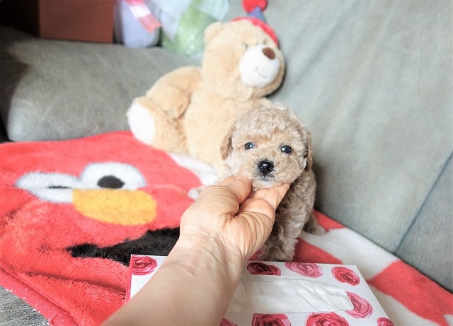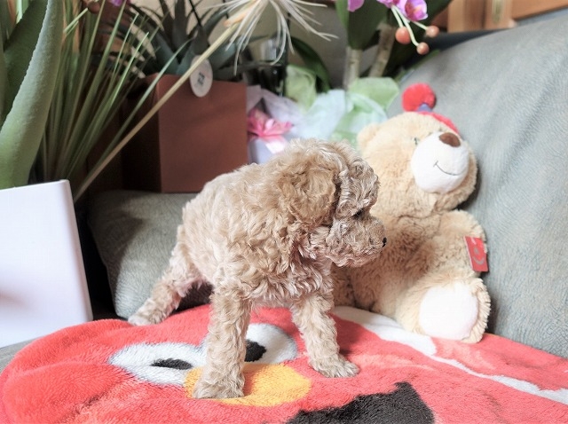 石原様、この度は愛らしいトイプードルの仔犬との素敵なご縁を頂戴しましたこと、心から感謝いたしております。 石原様との幾度のやりとりを重ね、生まれてから私の手元に来てくれるまで、石原様御夫婦の愛情をたっぷり受け、大切に育てていただいた事がよくわかりました。更に先住犬との関係性及び育て方等についてもご助言いただき、大変に助かりました。 また仔犬のお迎えについても、熊本から離れた場所にいる私にとっては悩みの種ではありましたが、その点についてもご配慮いただき、最終的にはスムーズに仔犬を我家に迎えることができ、ゴールデンウィークは賑やかな日々となりました。 これから、先住犬同様、大切には育てて参ります。 この度は素敵なご縁をありがとうございました。(山口県 女性)
