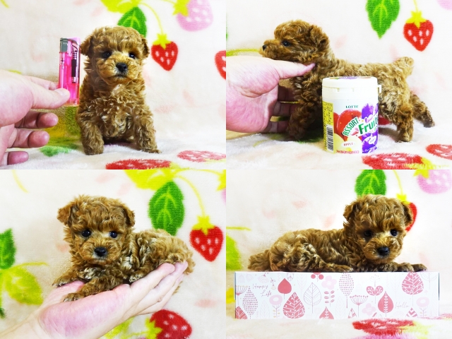 | コメント | ☆マイクロティーカップ予想!!☆ホント小っちゃくてビックリですよ!! 人懐っこい甘えん坊♡まん丸なお顔に短いお鼻円らな瞳の男の仔♪ 小っちゃい幼顔で見つめられるとキュンッ!!となっちゃいますよ^^ 毛質も良好☆クルックル巻毛に毛量も充分で綺麗なレッドです!! 小さくてもとっても元気ティーカップ兄弟と仲良く遊んでます♪ 生後60日の体重は約400g成犬予想体重1.5kgくらいだと思います!! 無理に小さく育てた極小とは違ってとっても元気な健康優良児♪ 身体のバランスが良くしっかりした硬い胴で骨量多い丈夫な仔☆ 現状噛合せや骨格・関節形成など欠点の心配はありません!! 離乳も済み食欲旺盛でドライでカリカリ!!いつでもお引き渡しOK♪ 素敵なご家族様からのお問い合わせをお待ちしております^^ 【その他諸費用】 5種ワクチン接種費用:6千円【税・画像入証明書付・健康診断込】 ※お迎えの場合で【生体代金】+【ワクチン接種費用】のみです。 ●血統書登録団体:JKC(※3ヵ月以上要す事もあります) |