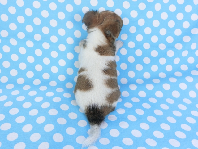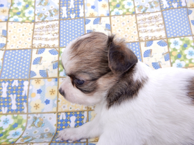 | コメント | 父 ブラックタン 母 ホワイト&フォーン 成長時の予想体重は2.2~3.3キロ 現在モレラあります。 スタッフの取得資格 (社)JKC 全犬種審査員2名(社)JKC 単犬種パピヨン審査員1名(社)JKC スチュアート1名(社)JKC A級ハンドラー1名 (社)JKC C級ハンドラー1名 (社)日本愛玩動物協会 愛玩動物飼養管理士1級1名 (社)日本愛玩動物協会 愛玩動物飼養管理士2級2名 (学)AIK 認定グルーマーライセンス1名(学)AIK 家庭犬しつけインストラクター1名(社)ICCキャットグルーマーライセンスB級1名 (学)AIK トレーナーライセンス1名 動物の愛護及び管理に関する法律による動物取扱責任者2名 |