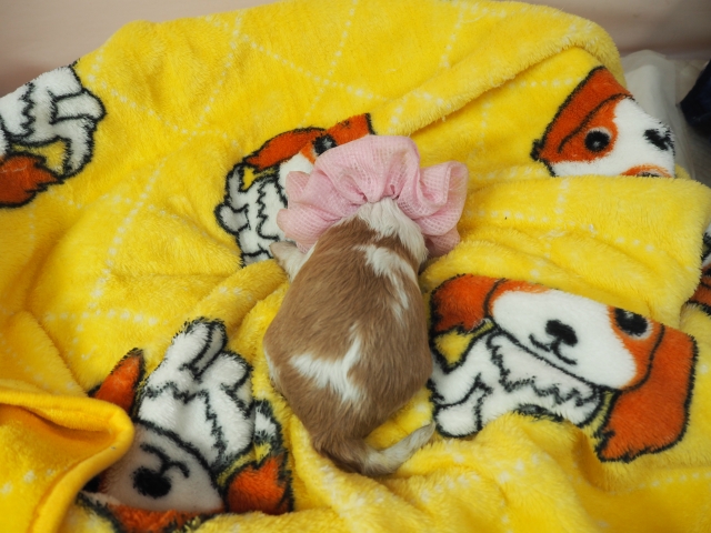 | コメント | お父さんはJKCチャンピオンのイエシゲ君、お母さんはチャンピオン直子のサマンサちゃんから生まれたキュートな女の子です。(桃リボン) 健康状態は、問題有りません。 すくすく育っています。 |