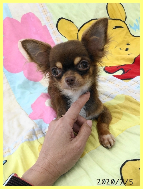 | コメント | 両親共にJKCチャンピオンの子供で血統優秀です。 PRA遺伝子検査済みでクリアです。 とてもおとなしくてかしこい女の子でまず吠えたりもしませんし、優しい女の子です。 当方でママ犬候補として残留をしていましたが、1歳を迎えて体重1.3キロと極小サイズの為、出産は可哀想かなと思い、可愛がってくださる方を募集します。 決して噛んだり吠えたりしないとてもかしこい子に育っています。 チワワは飼いたいけど思ったよりも大きくなってしまうのが心配、とか、極小サイズの子がどうしても飼いたいので成長がとまってから飼いたい、昼間留守にするので、子犬は低血糖などが心配、などという方にお勧めです。 1歳になったばかりでまだまだ子供ですが、すでに1回目の発情期も済んで成長は止まっています。 実際に見ていただけるとちいささとかわいらしさがおわかりいただけると思います。 ワクチン接種などすべて含んでの金額ですので、生体代金以外の費用は発生しません。 |