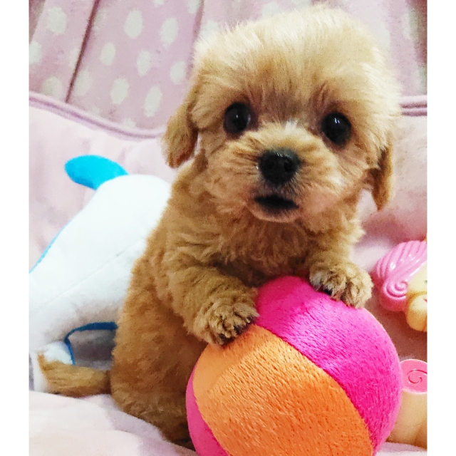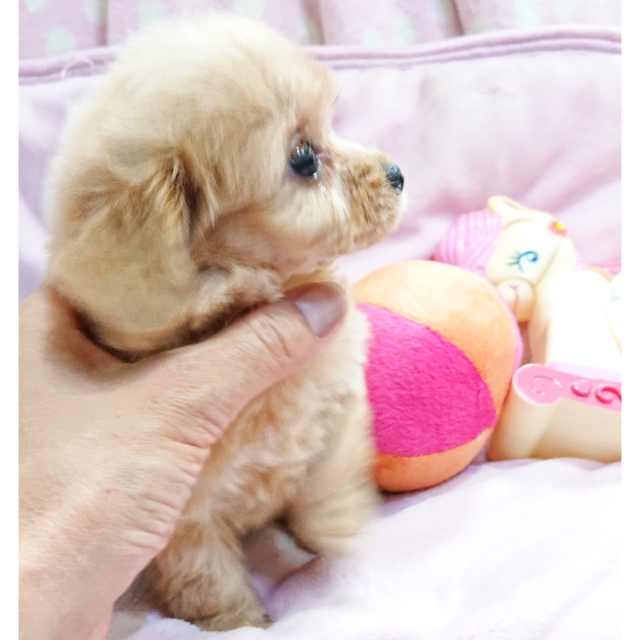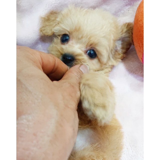 | コメント | 父・・プードル 母・・チワワ お目目がくりくりに大きい可愛い女の子です お鼻も短く詰まって居て幼いお顔立ちです 毛質はストレートに近く毛量は多いです プードルとのみっくすちゃんですので抜け毛も ほとんどで気になりません 小ぶりな子ですがご飯も食べてくれていますし 少しお転婆な所も有る元気な可愛い子です 産まれた時にお母さんが胎盤を破く時に 右後ろ足の爪の部分を 間違ってかじってしまい爪が2本有りません 歩いたり日常生活には全く問題は有りません 大人になって2kg~2,5kg前後の小さい サイズの仕上がり予想です 健康診断、1回目のワクチン済みです 生涯家族の一員として可愛がって下さる方を希望致します |