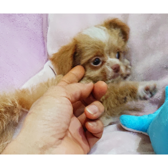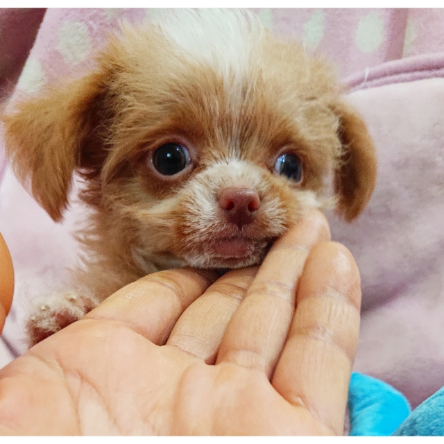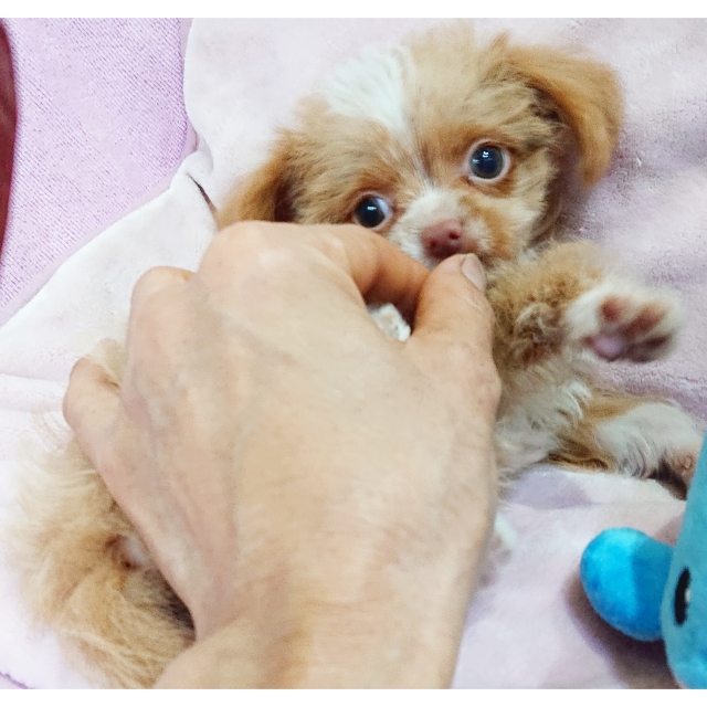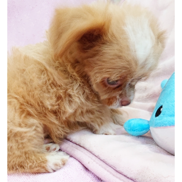 | コメント | 父・・ヨーキー 母・・チワワ まん丸なお目目が可愛い男の子です お鼻も短く詰まっています カールは少なめでふわふわしています 頭とお顔と胸に白い毛が有ります 足先全てに白い毛が有り手袋をはめている 様でとっても可愛らしいです ヨーキーちゃんは毛の抜けにくい犬種ですので この子も抜け毛は余り気にならないと思います 活発で元気な性格で遊ぶのは大好きです 少しシャイな所も有りますが甘えん坊な 可愛い性格です 大人になって2,5kg前後の可愛い仕上がり予想です 健康診断、1回目のワクチン済みです 生涯家族の一員として可愛がって下さる方を希望致します |