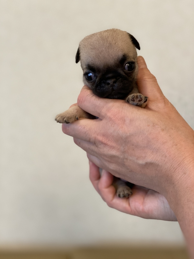 パグの飼育歴は30年以上になります。今年親の代から買っていた 黒パグを亡くしてから家を埋め尽くしているパググッズを見るたびに いつか新しい仔を迎えたいと思うようになりました。 北関東でブリーダーさんを探しているうちに木村様を知り、見学、購入の運びとなりました。 このたび性格も大変おおらかな素晴らしい仔犬をお譲りいただき大変感謝しております。 (茨城県 男性)