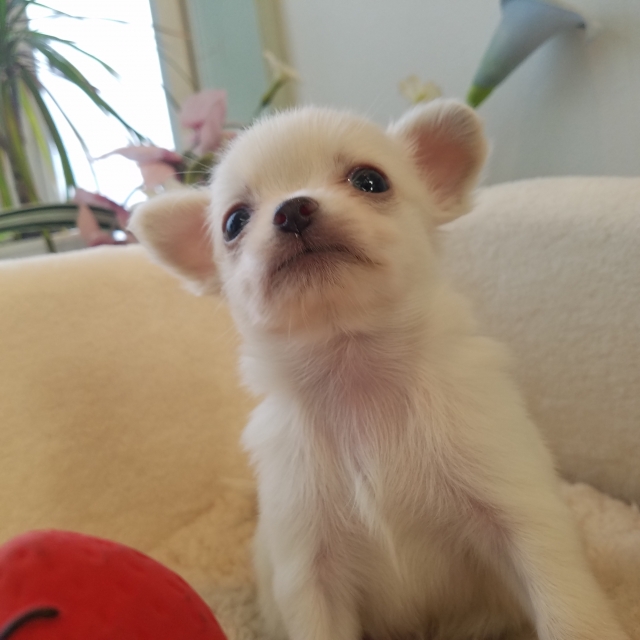 | コメント | 小さな両親から生まれた、女の子のような顔立ちの男の子です。 この子は標準サイズですので、チワワ初めての方、お子様のお相手としても、飼いやすいかと思います。 性格も人見知りしない、人間大好きな子です。ご家族のアイドルになる事、間違いないです(^^♪ お近くの方は是非見学にいらして下さい。 遠くの方は、お届けしますので、遠慮なくお問い合わせください。 優しいご家族様とのご縁をお待ちしております。 |