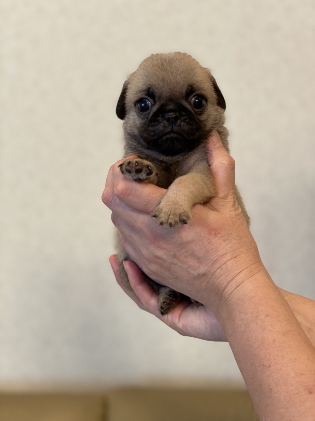パグの飼育歴は30年以上になります。今年親の代から買っていた 黒パグを亡くしてから家を埋め尽くしているパググッズを見るたびに いつか新しい仔を迎えたいと思うようになりました。 北関東でブリーダーさんを探しているうちに木村様を知り、見学、購入の運びとなりました。 このたび性格も大変おおらかな素晴らしい仔犬をお譲りいただき大変感謝しております。 (茨城県 男性)