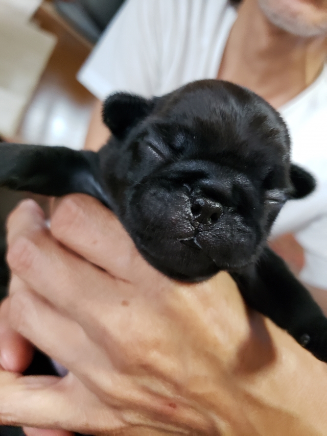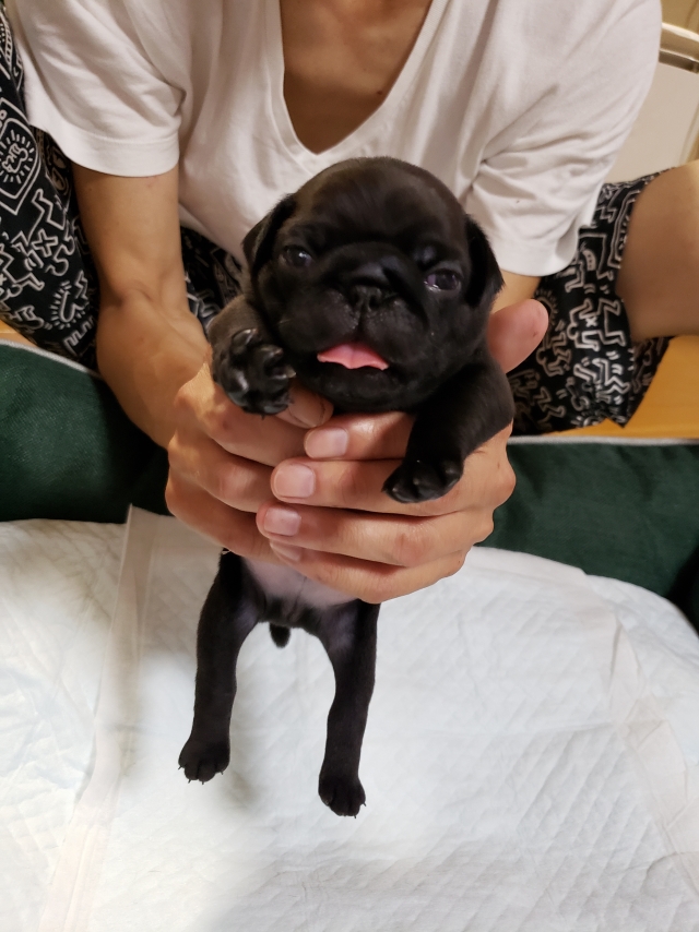 | コメント | 父親:5.8kg ブラック DM検査クリア 母親:7.2kg ブラック DM検査クリア 兄弟の中で一番母親似、白い胸毛がチャームポイント。 キレイな顔つきのイケメン君です! マイペースでパグらしいマヌケな雰囲気。 1人で少し離れて寝てたりしますが ママのお乳の時は素早く陣取ってるので元気いっぱいの三男坊です。 |