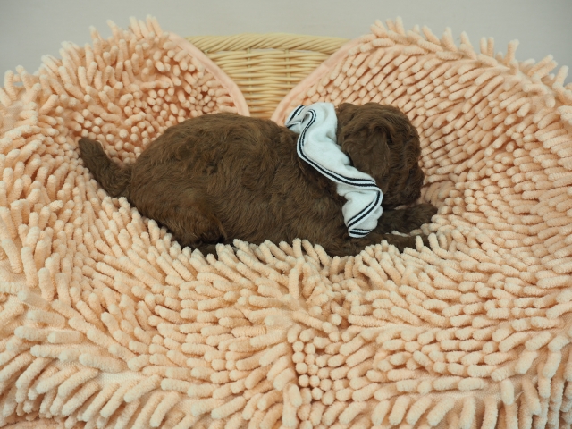 この度はとっても元気な子をありがとうございました。 見学の際は駅まで迎えにきていただき、説明もとても丁寧で安心しました。 空輸で送っていただき、ありがとうございました。 迎えてから一週間が経ち、家にも慣れて、へそ天で寝ています。 トイレトレーニングも、来た時から8割できていて、今ではほとんど失敗しなくなりました。 可愛く元気で、毎日元気に飛び跳ねています。(奈良県 女性)