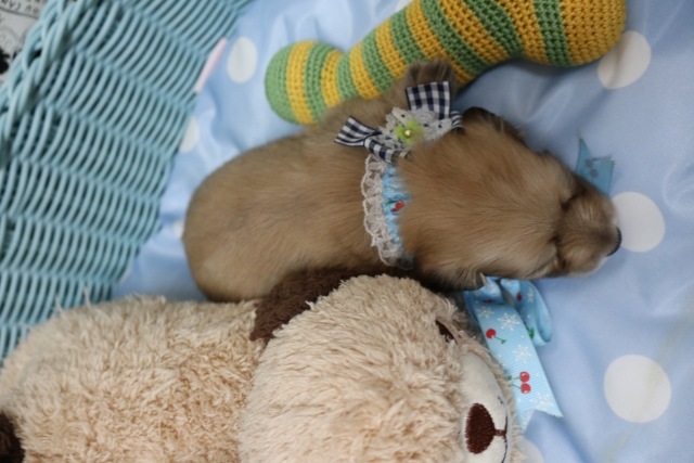 この度は可愛いカニンヘンダックスの女の子を譲っていただきありがとうございます。濱田さんのところからのお迎えは2頭目で、可愛さは初めの子でわかりすぎるほどわかっていたので絶対可愛くなること間違いなしで決めさせていただきました。 どんなことでも相談してくださいねと言う心強い言葉や、可愛い動画を送っていただいたりと本当によくしていただけました。 ワンちゃんは初日からアイコンタクトばっちり、よく食べ、よく寝て、元気いっぱいです。 家にきて1週間、先住犬と遊びながら元気に成長中です。 またよろしくお願いします。(大阪府 女性)