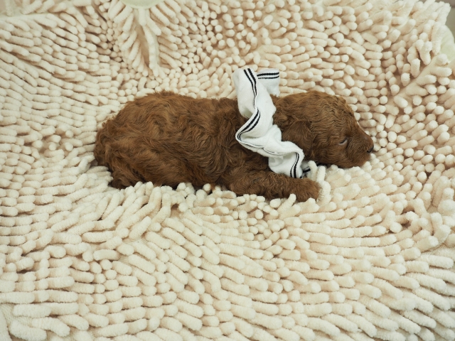 この度はとっても元気な子をありがとうございました。 見学の際は駅まで迎えにきていただき、説明もとても丁寧で安心しました。 空輸で送っていただき、ありがとうございました。 迎えてから一週間が経ち、家にも慣れて、へそ天で寝ています。 トイレトレーニングも、来た時から8割できていて、今ではほとんど失敗しなくなりました。 可愛く元気で、毎日元気に飛び跳ねています。(奈良県 女性)