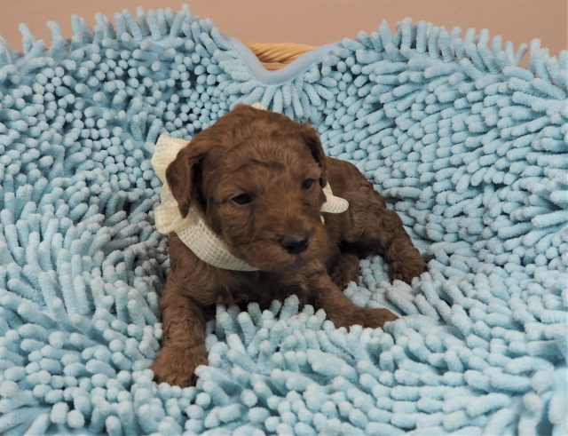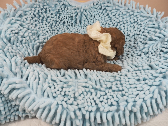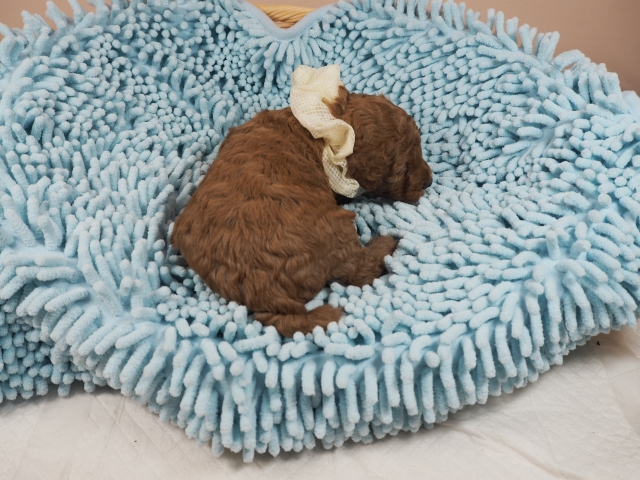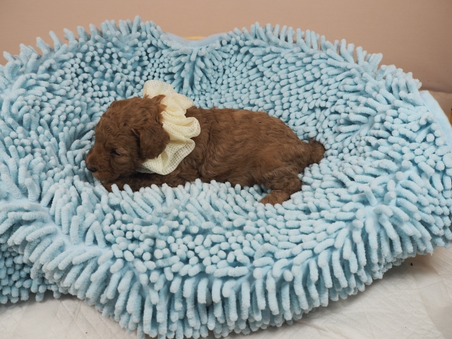 この度はとっても元気な子をありがとうございました。 見学の際は駅まで迎えにきていただき、説明もとても丁寧で安心しました。 空輸で送っていただき、ありがとうございました。 迎えてから一週間が経ち、家にも慣れて、へそ天で寝ています。 トイレトレーニングも、来た時から8割できていて、今ではほとんど失敗しなくなりました。 可愛く元気で、毎日元気に飛び跳ねています。(奈良県 女性)