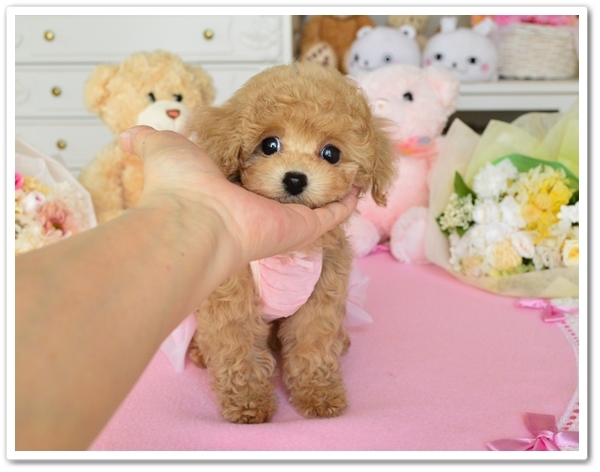 | コメント | 大きな大きなまん丸おめめで色素の濃い女の子 おめめとお鼻の間隔は黄金比 将来は大きなまん丸おめめのとても可愛いお顔になると思います 色むらのないきれいなアプリコットで毛質・巻きともにGood!! 性格はとても人懐こく人間大好きな女の子 ~~成犬時は1.6~2キロ予想〜〜 現在ムチムチコロコロで体重が載っていますが お顔がとーっても小さく、体の大きさはコンパクトです パパ犬1.3キロ、ママ犬2キロ ワクチン接種済、健康診断の結果全て異常なし フードを良く食べお腹はパンパン、健康状態はきわめて良好です 残留予定で様子を見ていましたが 小ぶりで収まりそうなので手離すことにしました 東北自動車道水沢ICより15分、奥州スマートICより5分 東北新幹線水沢江刺駅から20分です 水沢江刺駅から当方まで送迎いたしますので ぜひご見学にいらしてくださいませ |