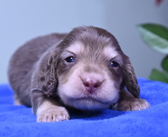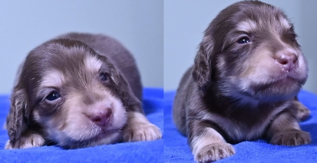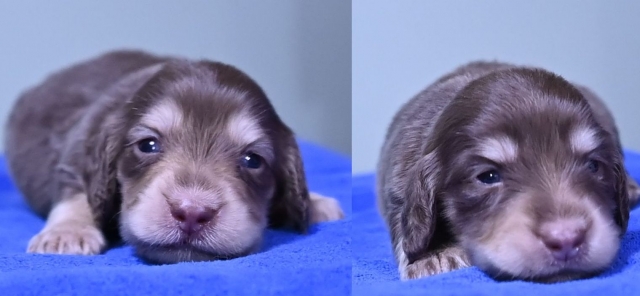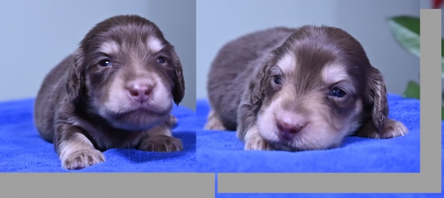 コメント | 濁りの無いクリームカラー(マヨネーズ色)のタンマークなので成犬時とても綺麗なお顔立ちのチョコクリに仕上がります。 低重心、ショートマズル! 拘りの在る飼い主さんへ・・・ ダックス一筋36年の経験と実績! 拘りのダックスを、拘りのチョコクリを是非家族に・・・ 日本で初めて当犬舎が創った毛色(チョコ&クリーム)です(JKC血統書第一号発刊) 同時にチョクレートダップル&クリーム、シルバーダップル&クリームも私が毛色認定(JKCに於き)したカラーコートです。 この毛色をJKCに於いて登録申請できるようにしたチョコレート&クリームです。 同時に3カラー ★チョコレート&クリームタン ★シルバーダップル&クリームタン ★チョコレートダップル&クリームタン これは私が創り出したカラーコート(JKC)です。 |
