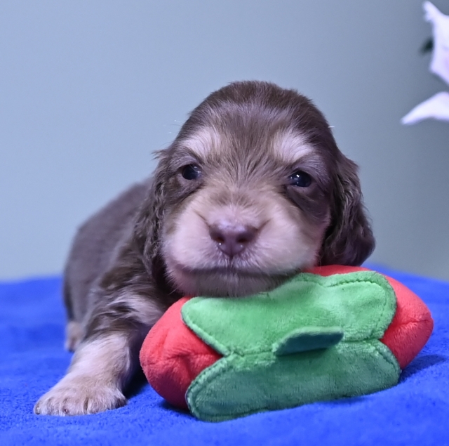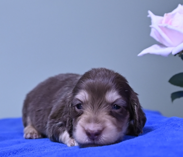 コメント | 濁りの無いクリームカラー(マヨネーズ色)のタンマークなので成犬時とても綺麗なお顔立ちのチョコクリに仕上がります。 低重心、ショートマズル! 拘りの在る飼い主さんへ・・・ ダックス一筋36年の経験と実績! 拘りのダックスを、拘りのチョコクリを是非家族に・・・ ★日本で初めて当犬舎が創った毛色(チョコ&クリーム)です(JKC血統書第一号発刊) 同時にチョクレートダップル&クリーム、シルバーダップル&クリームも私が毛色認定(JKCに於き)したカラーコートです。 この毛色をJKCに於いて登録申請できるようにしたチョコレート&クリームです。 同時に3カラー ★チョコレート&クリームタン ★シルバーダップル&クリームタン ★チョコレートダップル&クリームタン これは私が創り出したカラーコート(JKC)です。 |