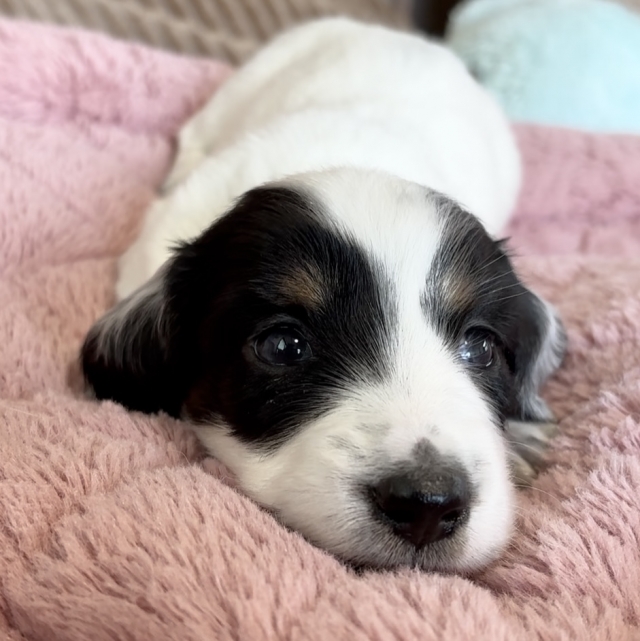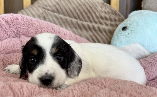 コメント | 9/29 健康診断実施 異常無し 当犬舎子犬は、 人間、成犬(当犬舎の)と 沢山触れ合いながら、して良いこと、悪いことなど 犬社会勉強しながら成長していきます。 社会化期どのような環境で過ごすかが 非常に大事です。 パイボールドは成長過程で柄変化する個体も有ります 当犬舎子犬はどの子も、 ご見学頂きましたお客様から感想ですが、 「実物の方が可愛い!写真写り悪い」など褒めて頂きます 血統書はコピーのみをお渡しになります!! 理由 託しました子犬が繁殖に使用されるのを避ける為 転売防止の為。 ️ MIXではございませんので、 血統書は発行致します。 血統書の子犬マイクロチップ番号と子犬に挿入済マイクロチップ番号は同じです。 【マイクロチップリーダーで番号読み取れます】 お渡し致しましたコピーの血統書が、 ご購入された子犬の血統書で間違い無い事が、どなたでも、確認とれます。 一般のご家庭で過ごす分にはコピーで支障はございません。【繁殖の際に原本が必要】 当犬舎は子犬の生まれた日からお引き渡し日までの成長の写真動画をお渡ししております。 当犬舎出身の子達の親族会等あり、我が子の親戚犬とも繋がることが可能です。【希望者のみ】 健康な子犬をご紹介出来ます様に、両親犬にPRA、CL、骨異形成症の遺伝病検査済です。 PRA【進行性網膜症】 CL、【神経セロイドリポフスチン】 骨異形成症 等の遺伝病を発症する事はありませんので、 ご安心下さい 詳しくは、ブリーダープロフィール欄に記載しておりますのでご覧に頂けましたら、幸いです。 胴長短足のダックスは腰膝に負担がかかりやすい体型です。ヘルニア、パテラのリスク軽減する為、骨格、筋肉がしっかりした個体になるように心掛けてブリーディングしております。 お顔や身体の柄は、このまま変わらない子や、変わる子も居ます。 サイズもあくまで予想となります。 【その子の生まれ持った体格や、 成長する段階の食べ物、運動量など、生活環境により変わってきます】 ミニチュアサイズの子、カニンヘンサイズに近いの子、ミニチュアサイズオーバーに成長した子と旅立ちました先でそれぞれです。 柄を重視なさる方は、ある程度、柄の予想がつくまで、 サイズを非常に気になさる方も成長の様子を見られる事をお勧め致します。 お引き渡し前に、初回ワクチン、検便、簡易健康診断をしてお渡しとなります。 【獣医師の健康診断表をお渡し】 初回ワクチン代は別途、回数分必要です。 パパ犬、ママ犬、兄弟犬達、人間と沢山触れ合い、一番大切な社会化期を過ごして成長します。 子犬、親犬共に、管理が行き届く環境(一般家庭に近い)で生活しております。 写真は随時更新致します ママは5キロ ブラックタンパイボールド ビビリな面もありますが、甘えん坊。 パパは、6キロ ブラックタン 初めましての方に人見知りしますが、 慣れたらグイグイ甘えてきます。 もっと沢山の写真や動画などご覧になりたい方はお気軽にお問い合わせください。 犬舎にご来舎にての見学の ご希望のお客様は、予めご見学希望日を複数日、お知らせ下さい。調整させて頂きます。 その際ご来舎される人数、交通手段を添えてお問い合わせ頂きますと助かります。 WEB見学【LINEビデオ通話使用】も、お申し付けください。 実際にご来舎を迷われる場合は、先にWEB見学され、気に入って頂けましたら、実際にご来舎頂くと言う事も可能です。 勿論WEB見学は無し最初から直接ご来舎見学でも大丈夫です。 子犬の予約【子犬の確保】権利は、お問い合わせ、ご見学の順番では無く、ご予約金をお支払い頂きました方が、優先となります為、メール、掲示板等、やり取りの最中、ご見学日を具体的に取り決め後でも、売約済みになる可能性もございます。 ご見学日の前日までは、売約済みになってしまう可能性もある事をご了承ください。【ご見学日前日に当犬舎から明日ご見学よろしくお願い申し上げます。との連絡致します。それ以降ご見学までは、優先的にご案内になります】 ご見学に際してお願い事です 同じ子犬に、ご見学がとても集中してしまう事がございます。 同日の同一子犬のご見学は、子犬のストレス、疲労を考慮しまして受付しておりません。 同日の見学希望が重なる場合は、後のお客様にはご見学日変更をお願いする流れになります。 実際触れ合い、父母犬をご覧になりご決断は重要ですので、ご見学は大歓迎です。 殆どのお客様が真剣にご検討でご来舎して頂いてますが、ご見学意図が、異なるお客様もいらっしゃいます。 当犬舎の子犬でなくても別に良い方。 横須賀に用事があったついで 動物触れ合いコーナー感覚。 希望犬種が定まってなく ダックス以外もご検討中の方。 子犬を迎える事をご家族全員が 希望されてない方。 今は子犬お迎えできる時期、環境でない方。 上記の様に、ご見学の意図から外れてます方を優先してしまいますと、真剣にご検討中のお客様のご案内が出来ません。